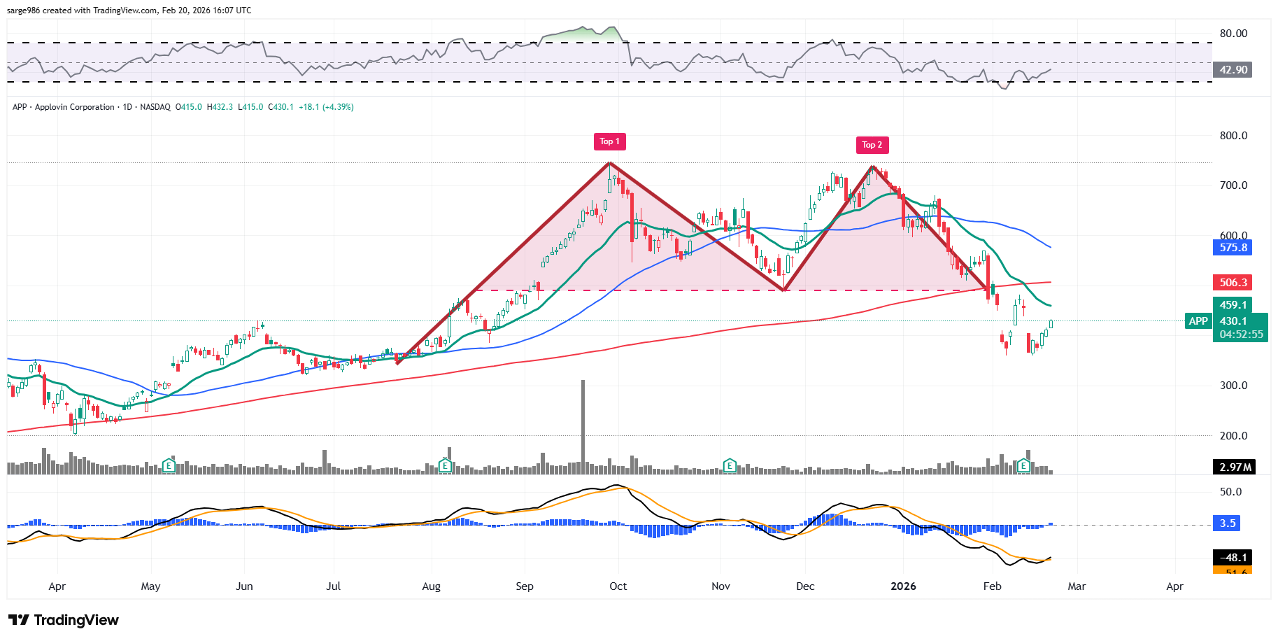 Can APP be bought here? I think maybe it can, for a trade, not necessarily for an investment. ​Readers will see the ominous double-top pattern of bearish reversal that ran from July 2025 into very early February. That pattern ran with a $489 downside pivot. The shares bottomed at $359 a few days ago. That more than satisfies the double top.