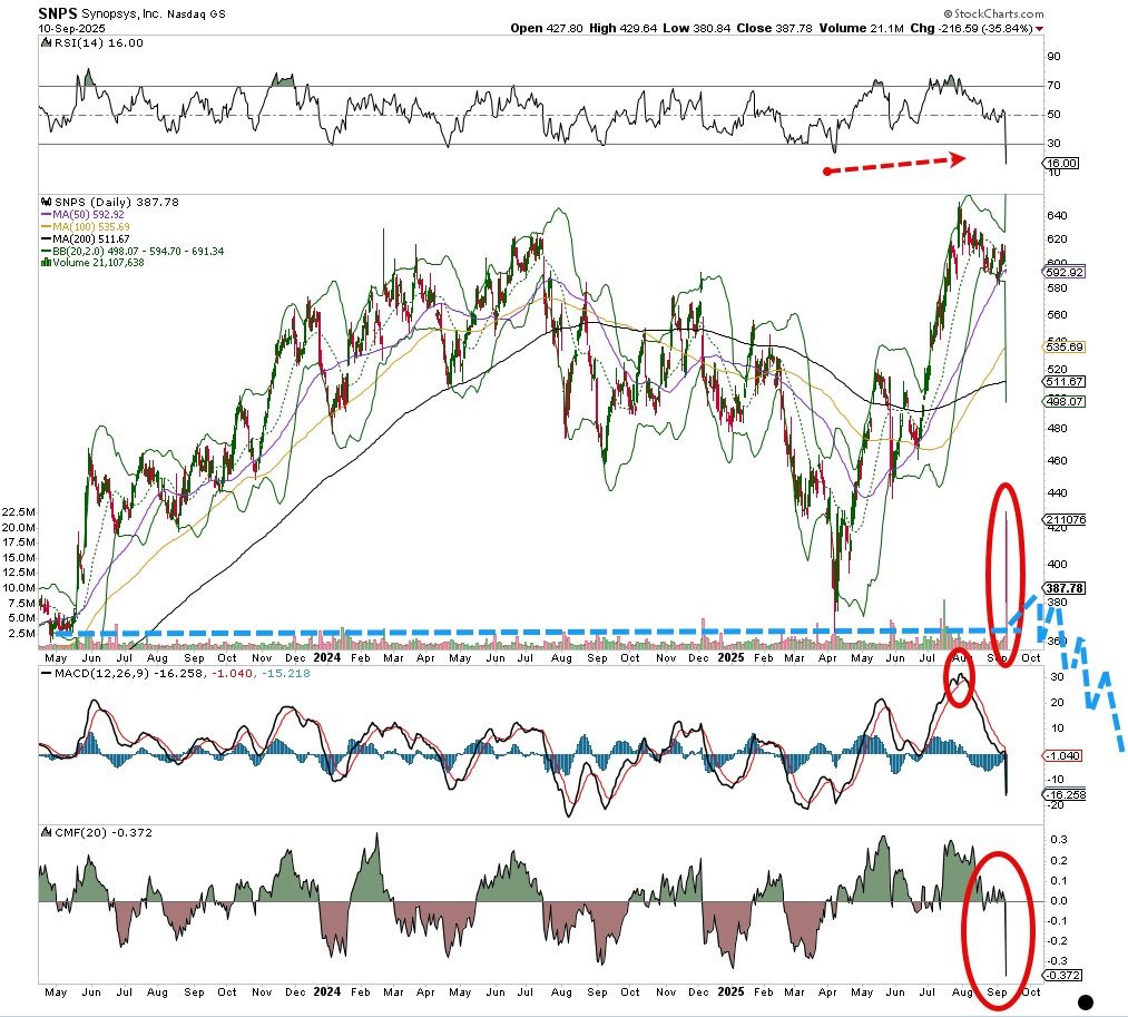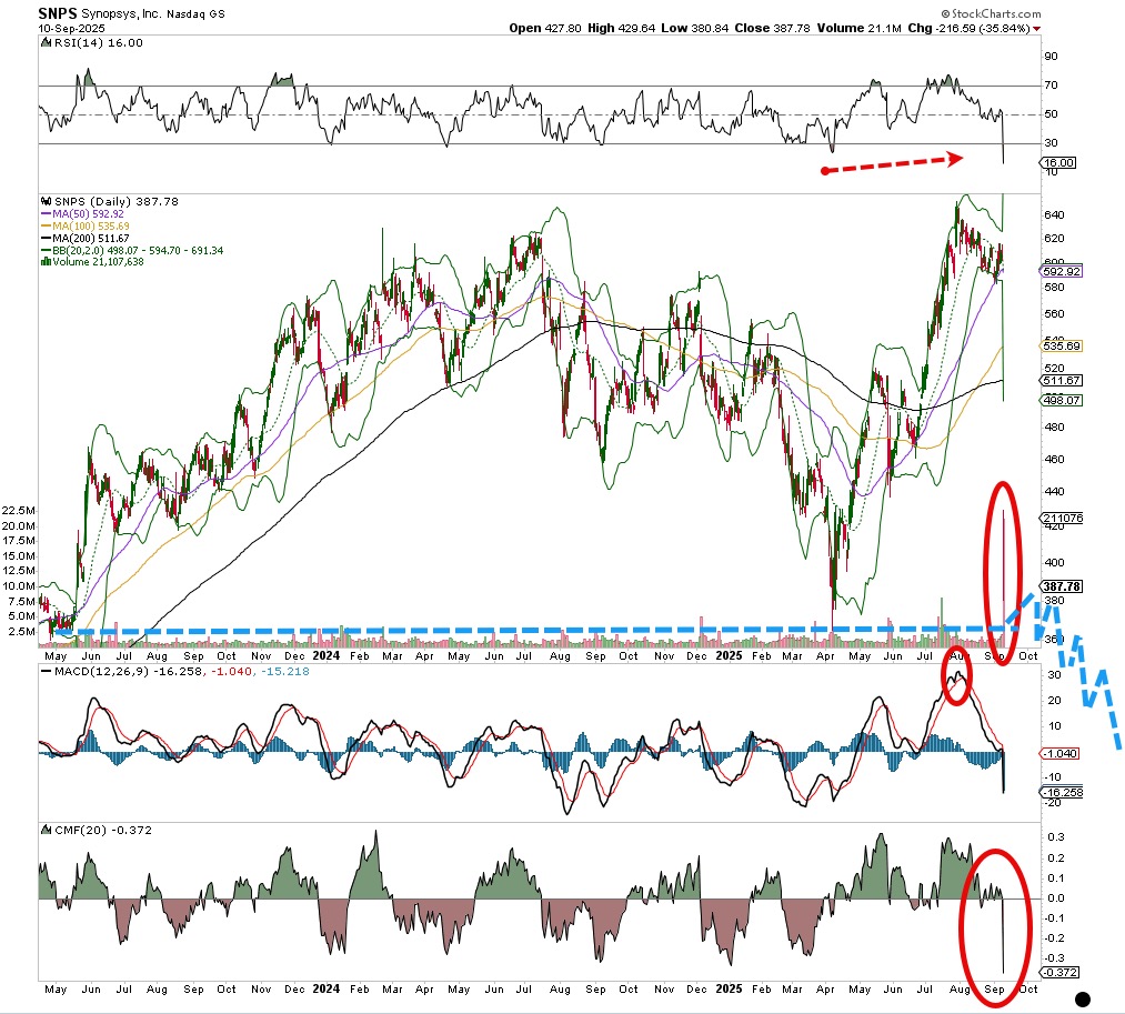 Horrific day for this massive tech company Synopsis SNPS. It had to be its worst day in history, nearly 40% down in one session on the heaviest turnover ever. The sellers really unloaded on this thing Wednesday and it appears more downside is coming.
