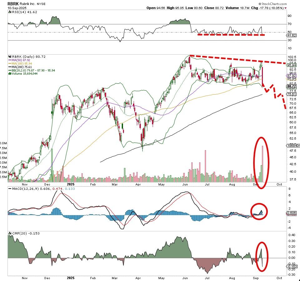 Just miserable action for this newer issue Rubrik (RBRK). The stock was slammed severely, a series of lower highs/lower lows was the trend and that continues. The massive down session on heavy volume tells us the bears are not finished yet.