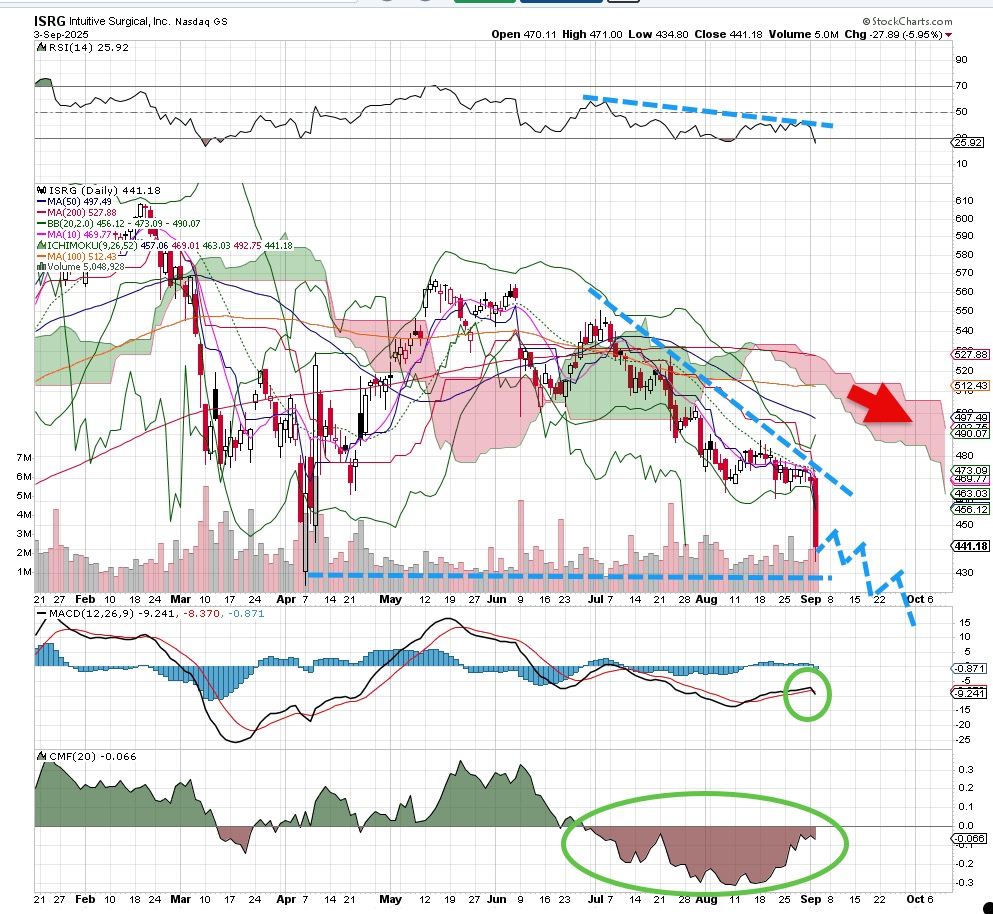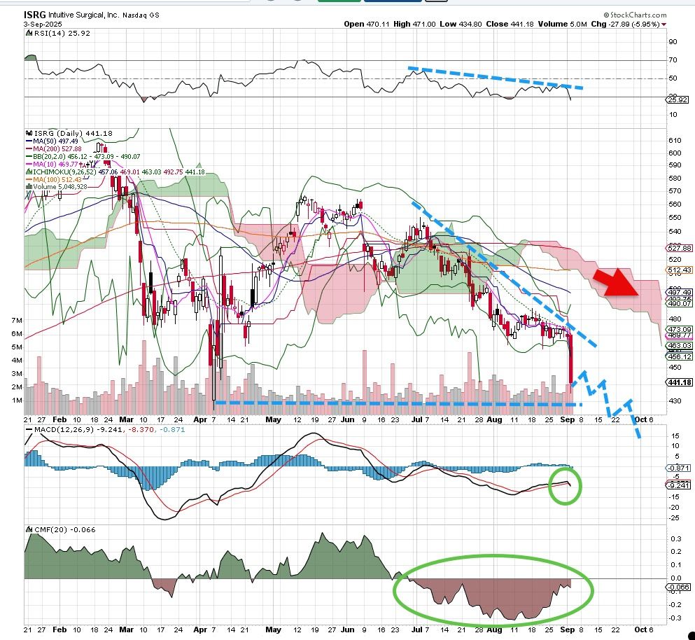 A downtrend within a sharp market uptrend is not healthy, and that is what we see for Intuitive Surgical ISRG. A serious wave of lower highs, lower lows is our textbook definition of a downtrend. Further, with the stock market making new highs and broadening out, a name like ISRG failing here is suspect. We would not trust a move upward on this name and if it did rise it would be a good short opportunity.