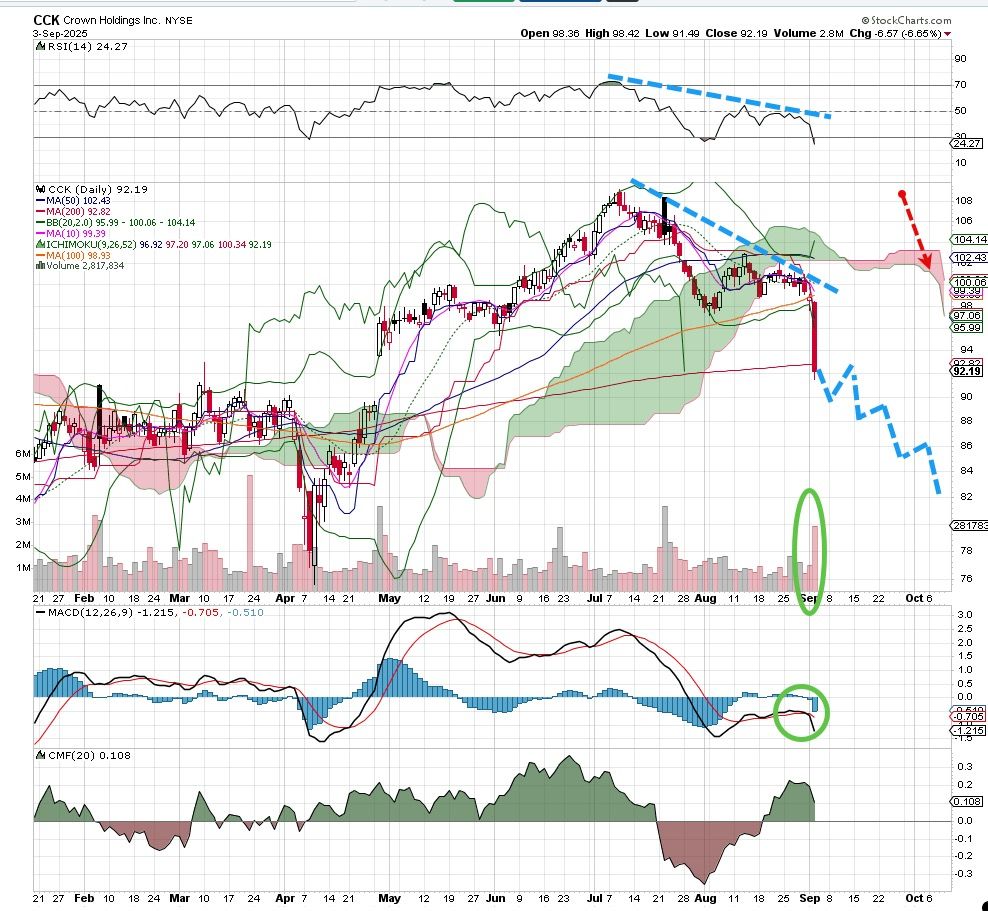 Let's take a stab at a short play here on Crown, looking to fill the April gap and then some, targeting the $82 area, with more downside to $75. The heavy volume is a clue, but put in a stop at $100 just in case.