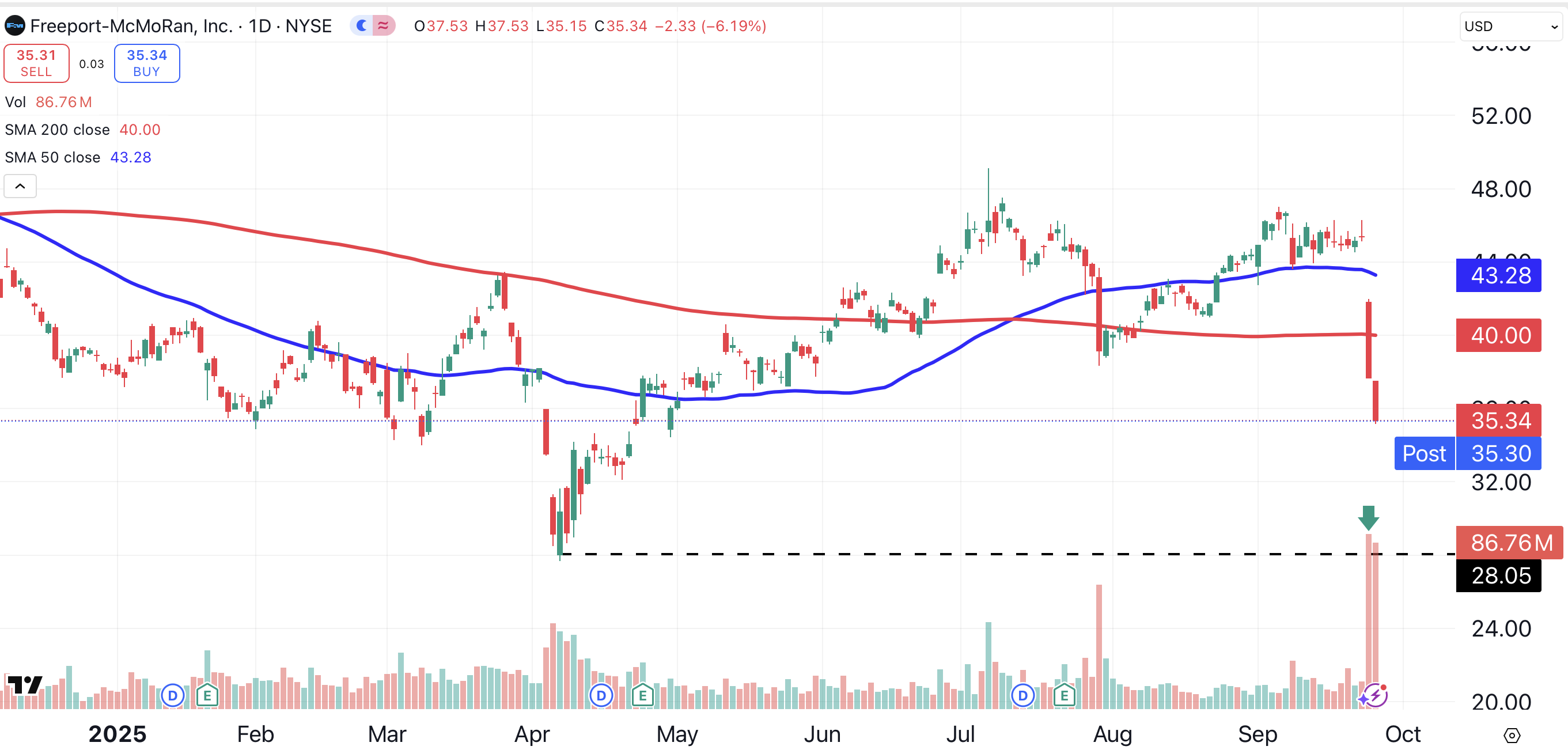 How far could shares of Freeport-McMoRan fall? The next key level of support is $28 (black dotted line). An entry close to that level would make sense, for either a short-term trade or a long-term investment.