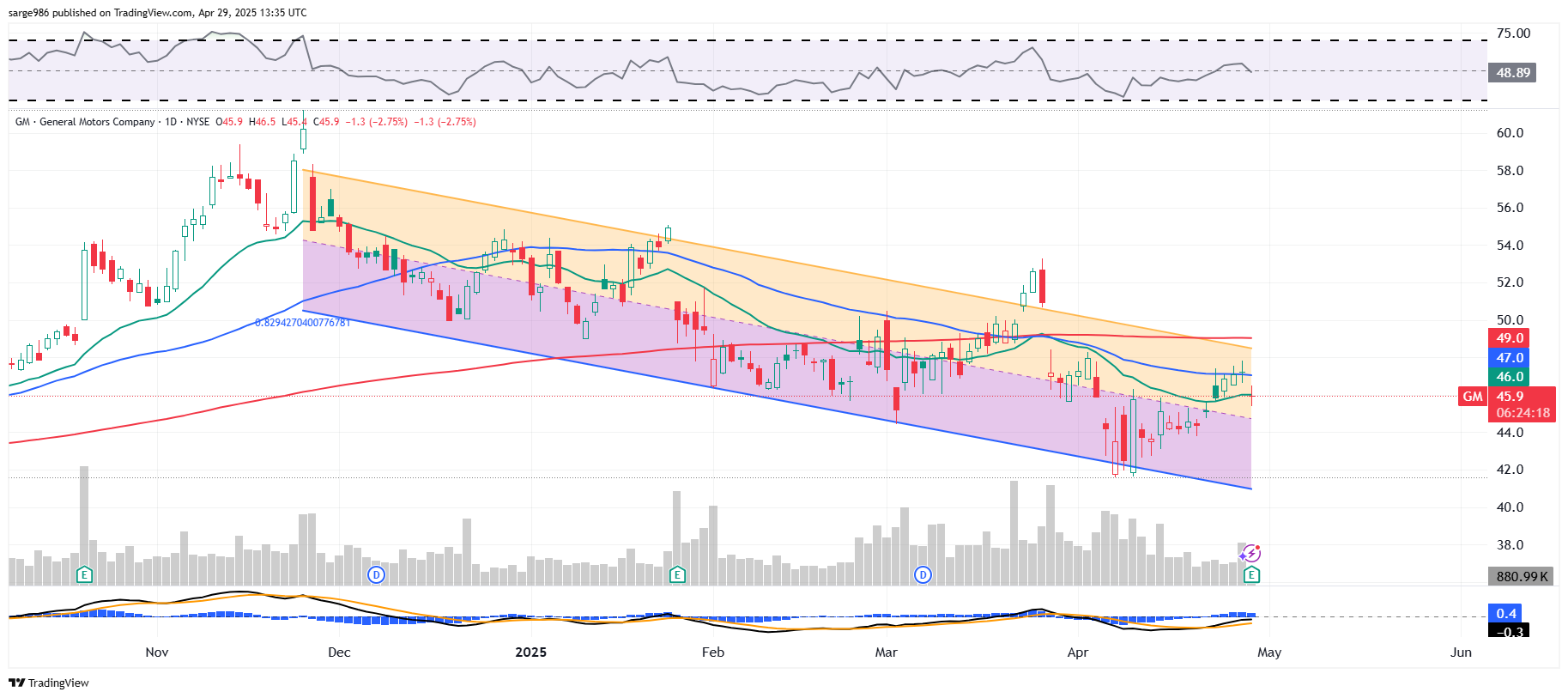 - Purchase one May 2 GM $46 call for $1.15