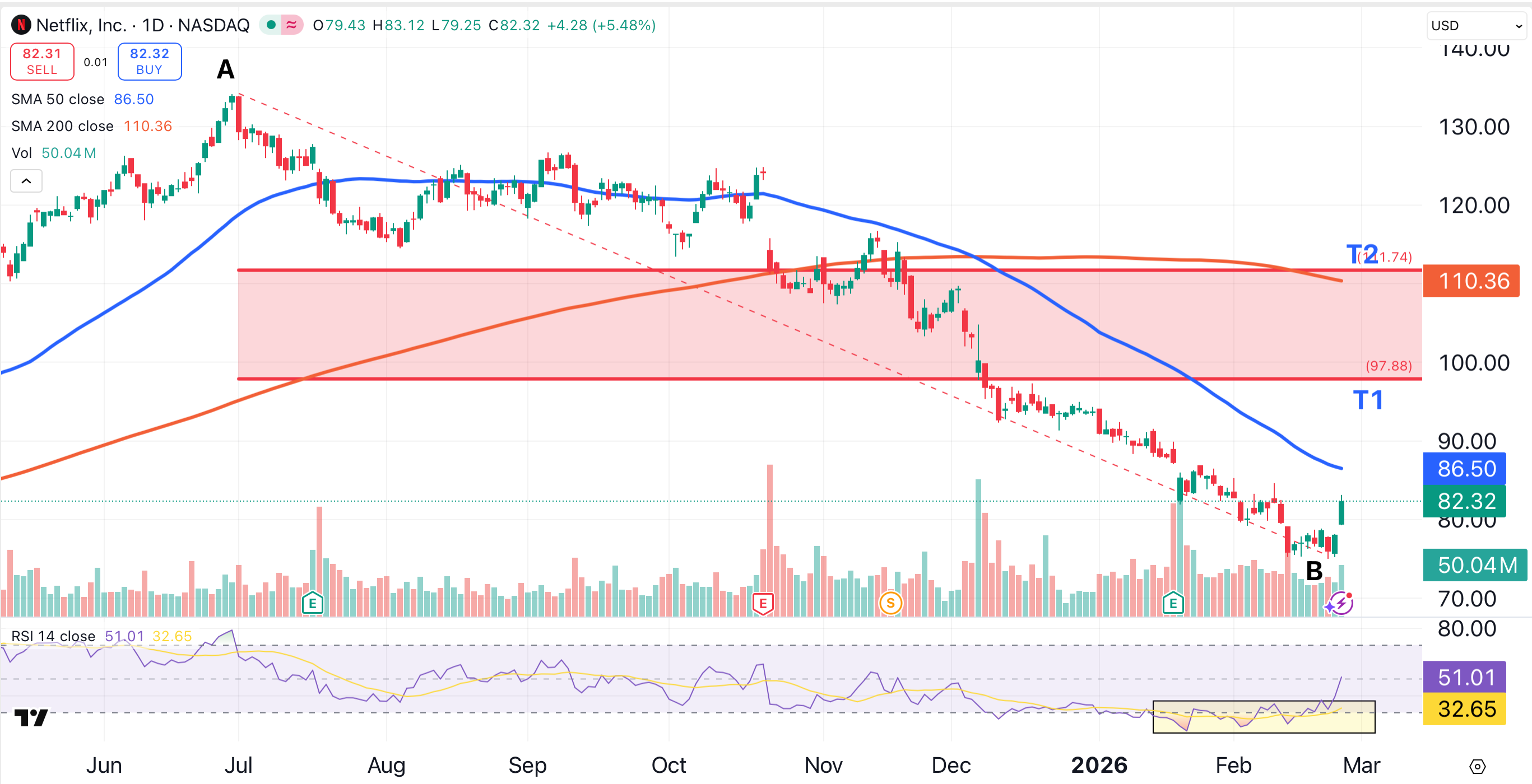 Our strategy for Netflix revolves around the stock’s selloff from its all-time high, set last July (point A) to its recent, year-to-date low (point B).
