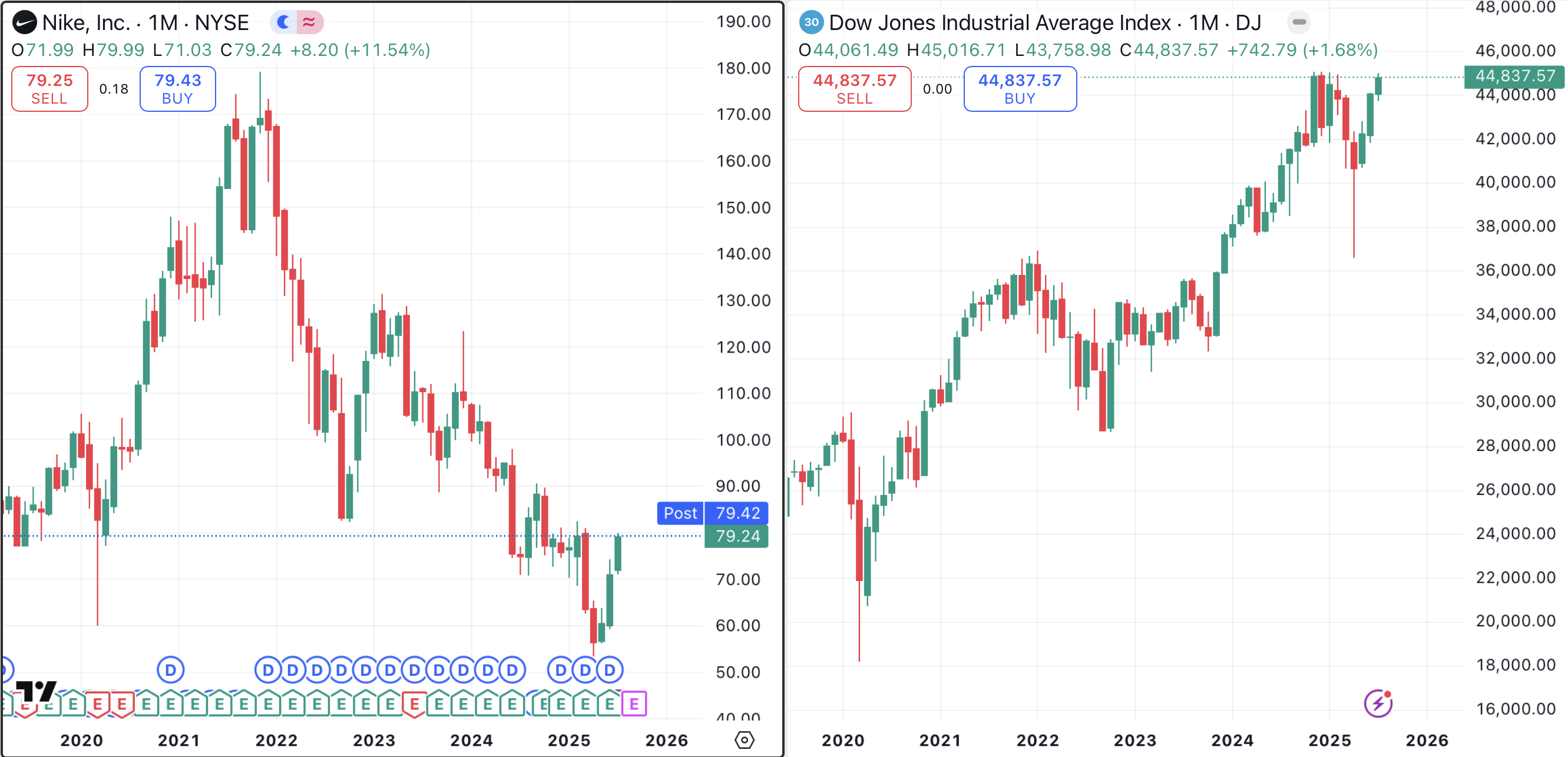 Clearly, 2022 marked a major turning point for the stock. We warned readers in early 2022 that Nike’s winning streak was about to end. Over the past five years, Nike shares (left chart) have lost 18.8%, while the Dow Jones Industrial Average (right chart) has gained nearly 70%: