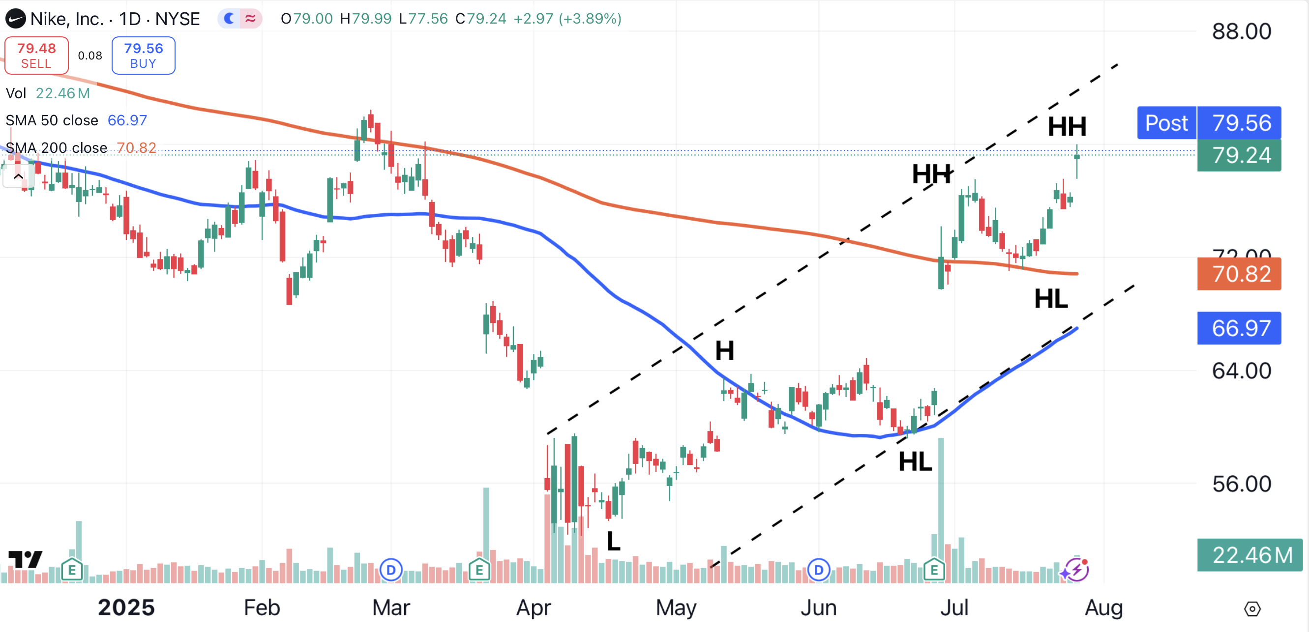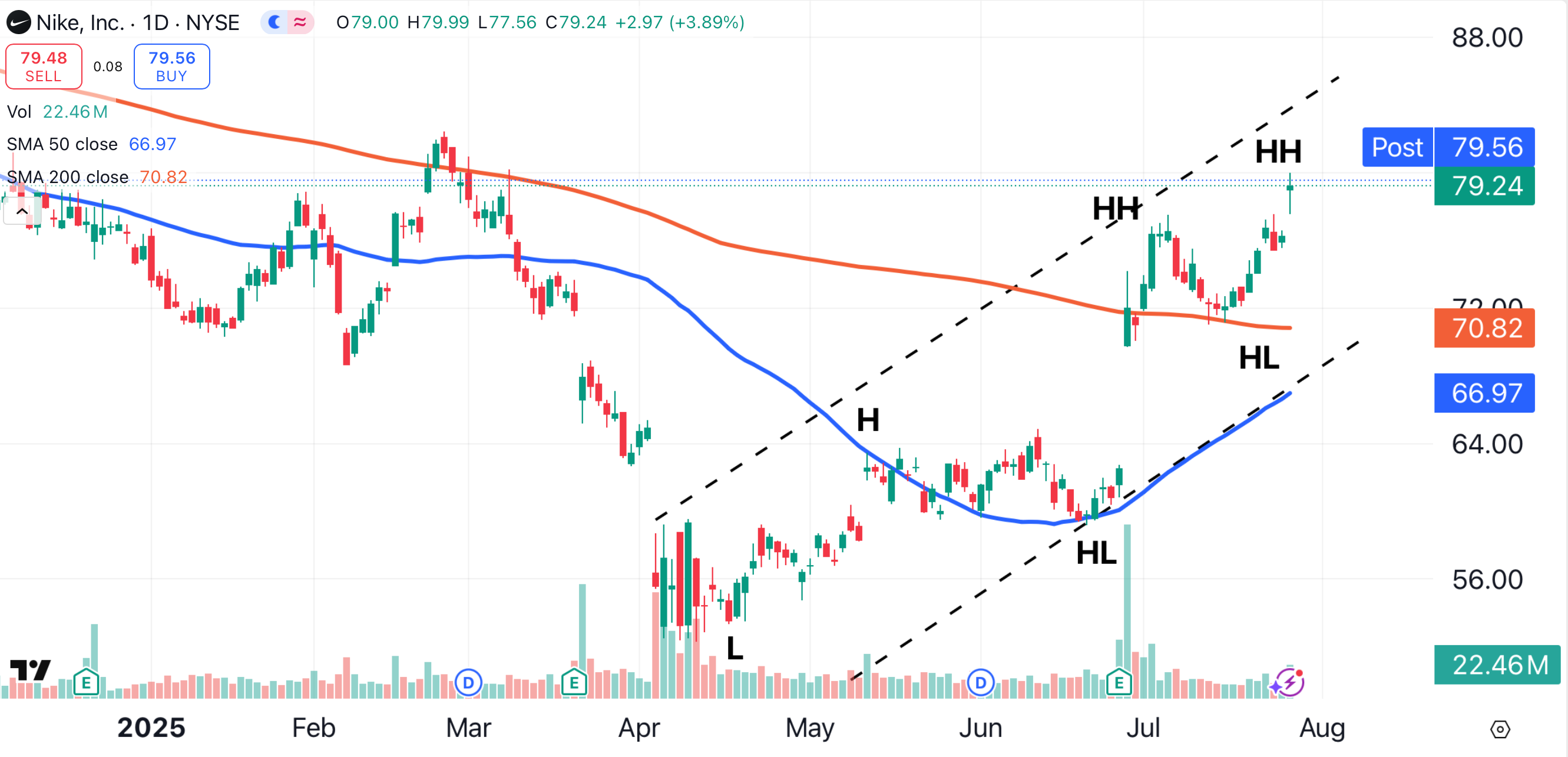 Nike shares need to trade above $81 to break that line. If Nike can climb above $82.44, it will form a higher high by eclipsing the stock’s year-to-date high (red arrow).