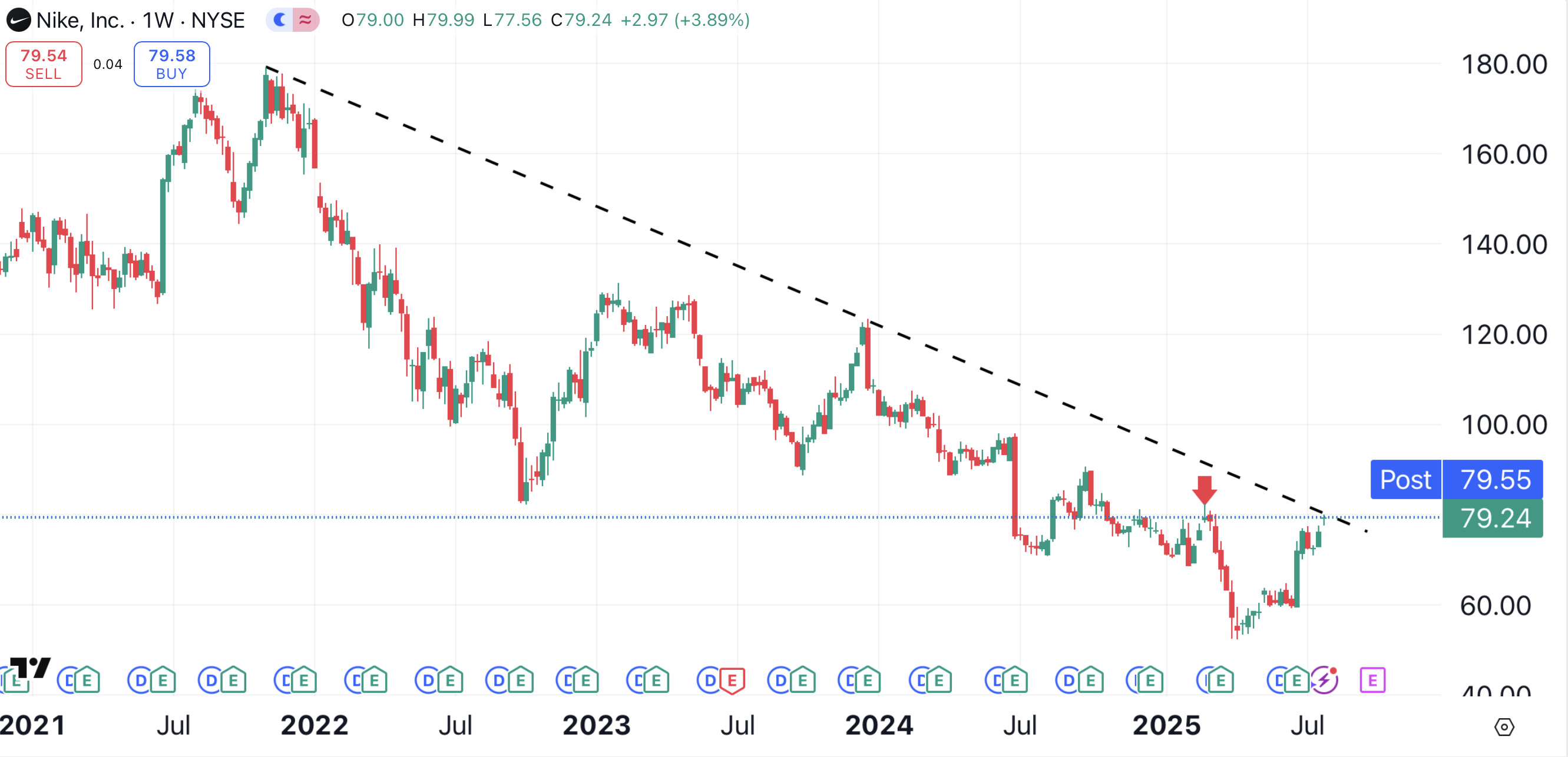 Zooming out to the weekly chart, Nike still needs to break above a long-term bearish trend line (black dotted line). That trend line has been intact for over three years.