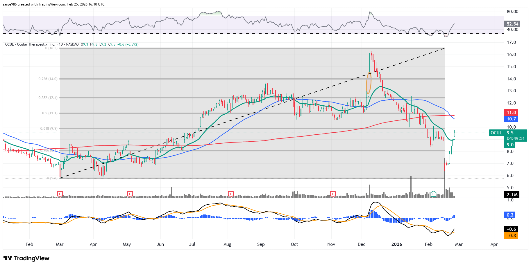 Readers will see that OCUL has retaken its 21-day SMA which has brought the swing crowd on board. I see the "Golden Cross." I don't take them as seriously when the 200-day SMA is not ascending at the time of the cross-over as when it is. ​