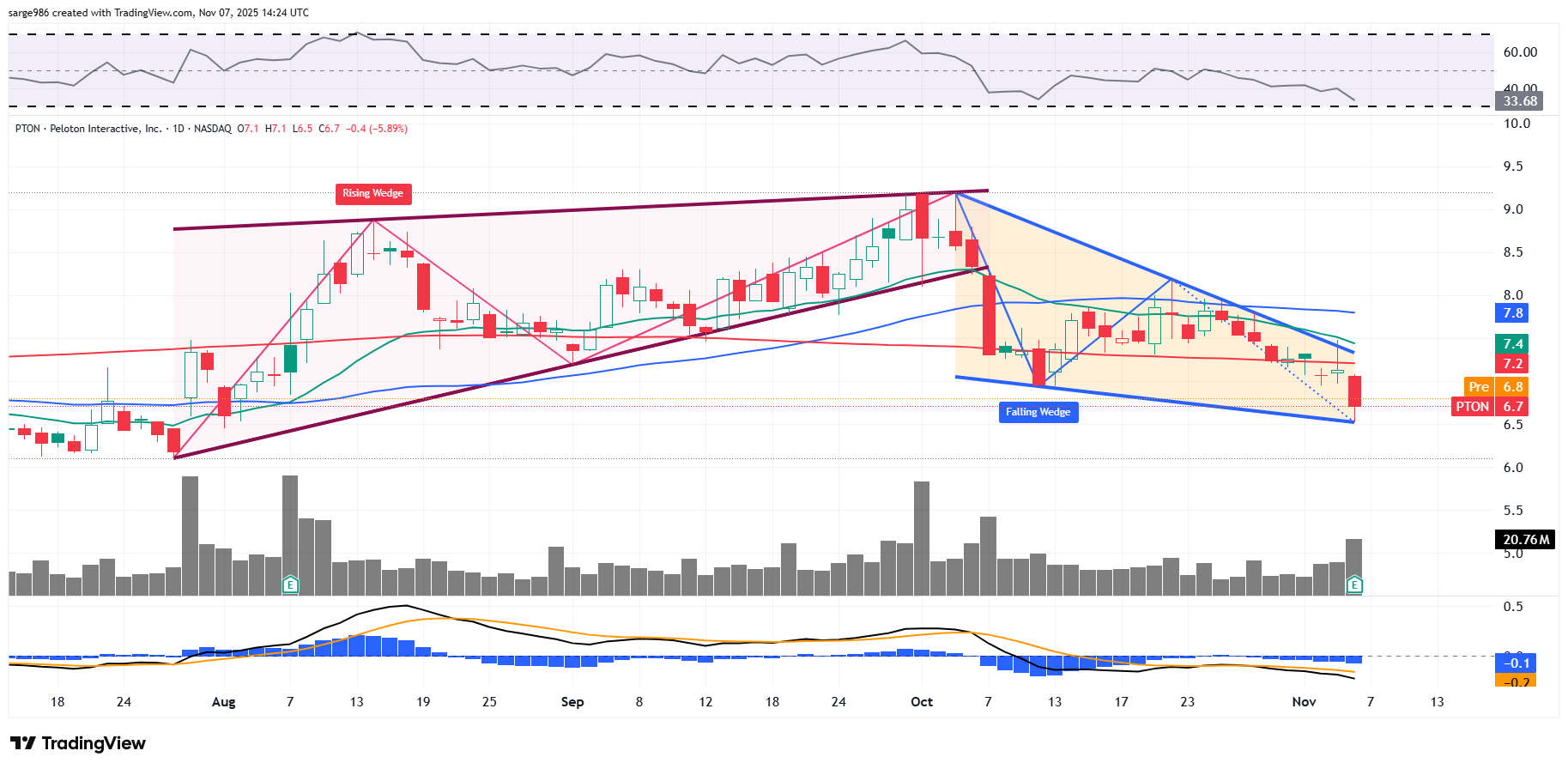 The bad news is that PTON surrendered its 200-day SMA on Thursday, which probably forces some portfolio managers to either exit the name or reduce long side exposure. You can tell by the increased trading volume that professional money was on the move. The indicators are kind of gross as well. relative strength is weak without yet being technically oversold. Below the chart, the daily MACD is in pretty rough shape.