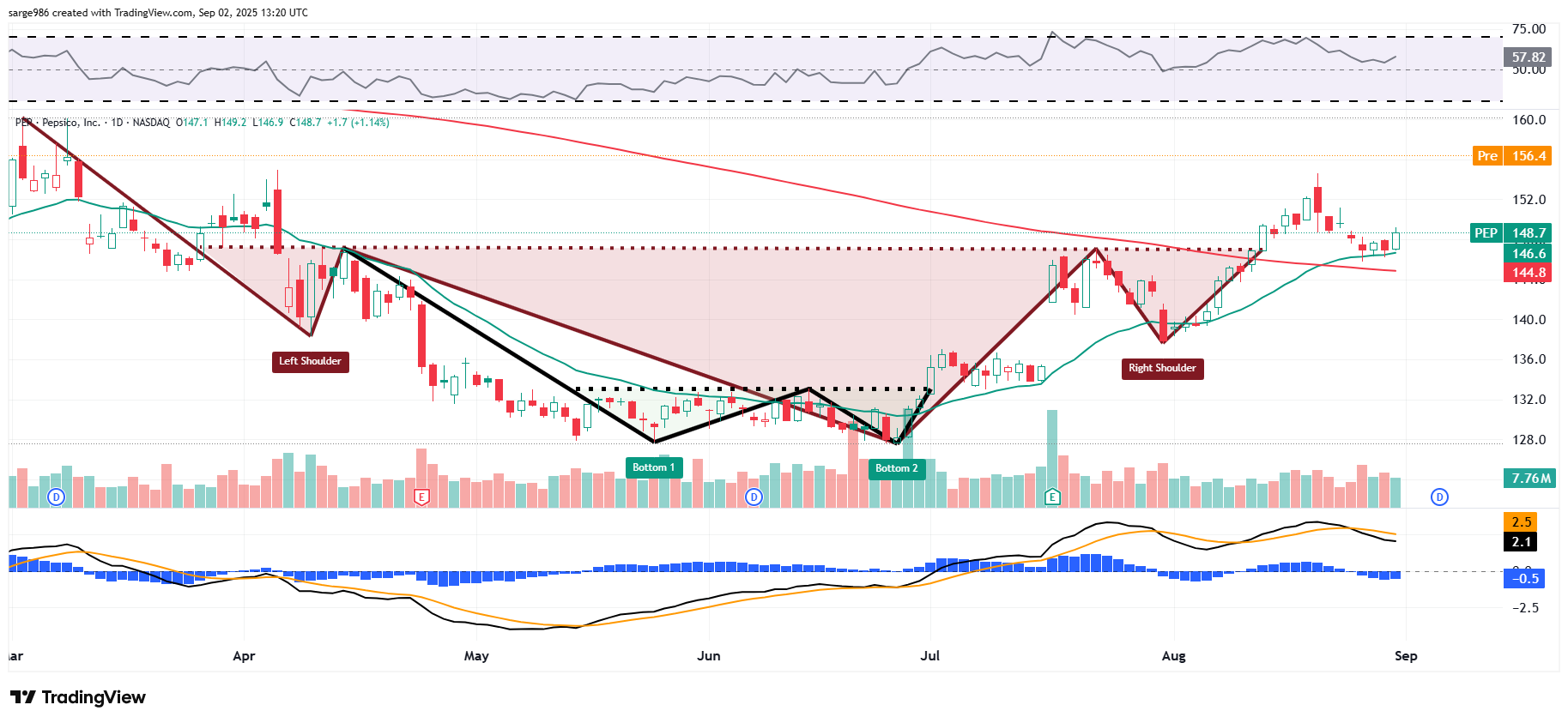 Looking at PEP, we have two different bullish technical patterns in play. ​There is a double-bottom pattern of bullish reversal with a pivot down around $133. That's not all that interesting to me. More interesting is the inverse head-and-shoulders pattern of bullish reversal with a $147 neckline/pivot. The double bottom just turns the inverse head-and-shoulders into a two-headed monster.