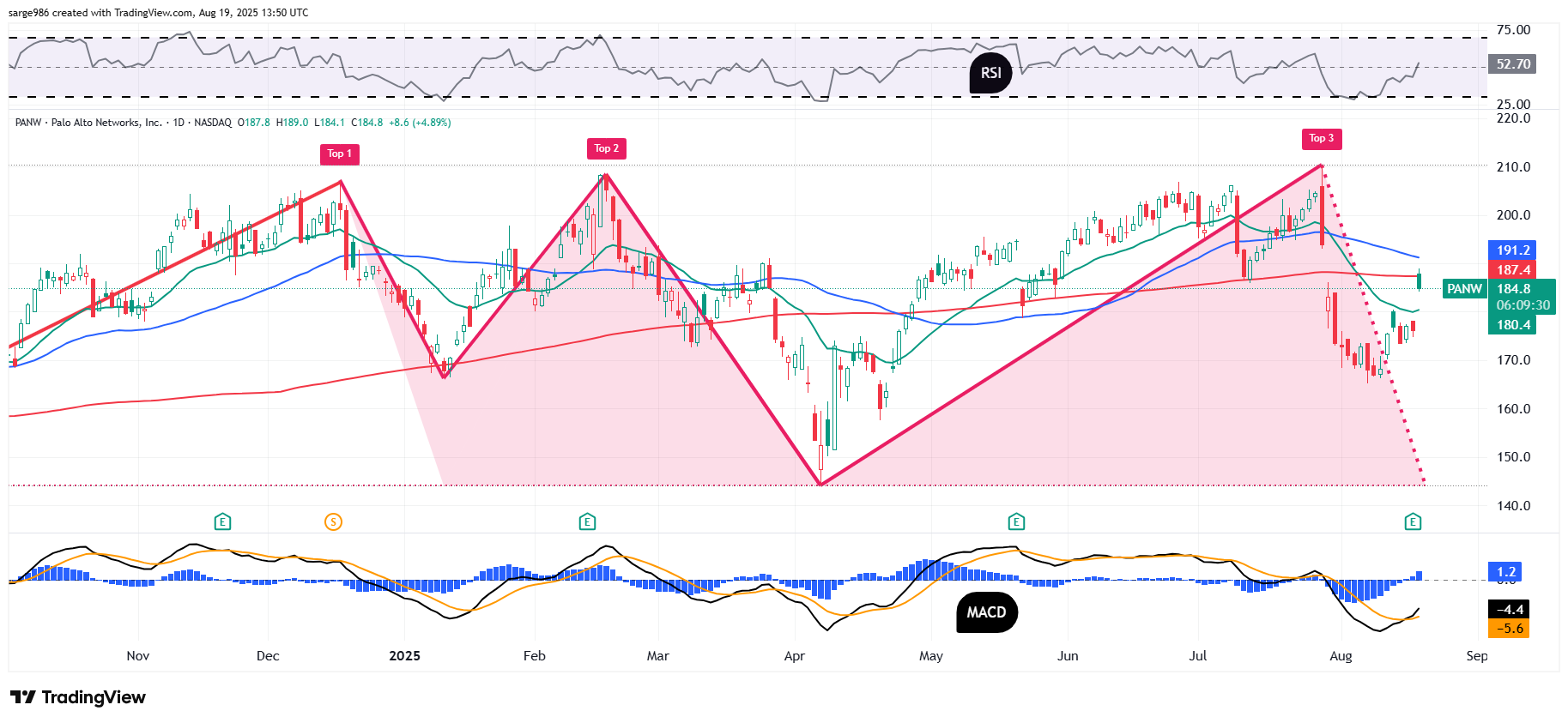 The 200-day SMA is the big kahuna on this chart. If PANW can hold that red line, portfolio managers will be forced to increase exposure to the stock. That will likely break the back of the bearish pattern in play. PANW has a reading for relative strength that has just moved back into neutral territory and a daily MACD that is just starting to look a little less ugly. The histogram of the nine-day EMA is back above the zero-bound and the 12-day EMA just crossed above the 26-day EMA.
