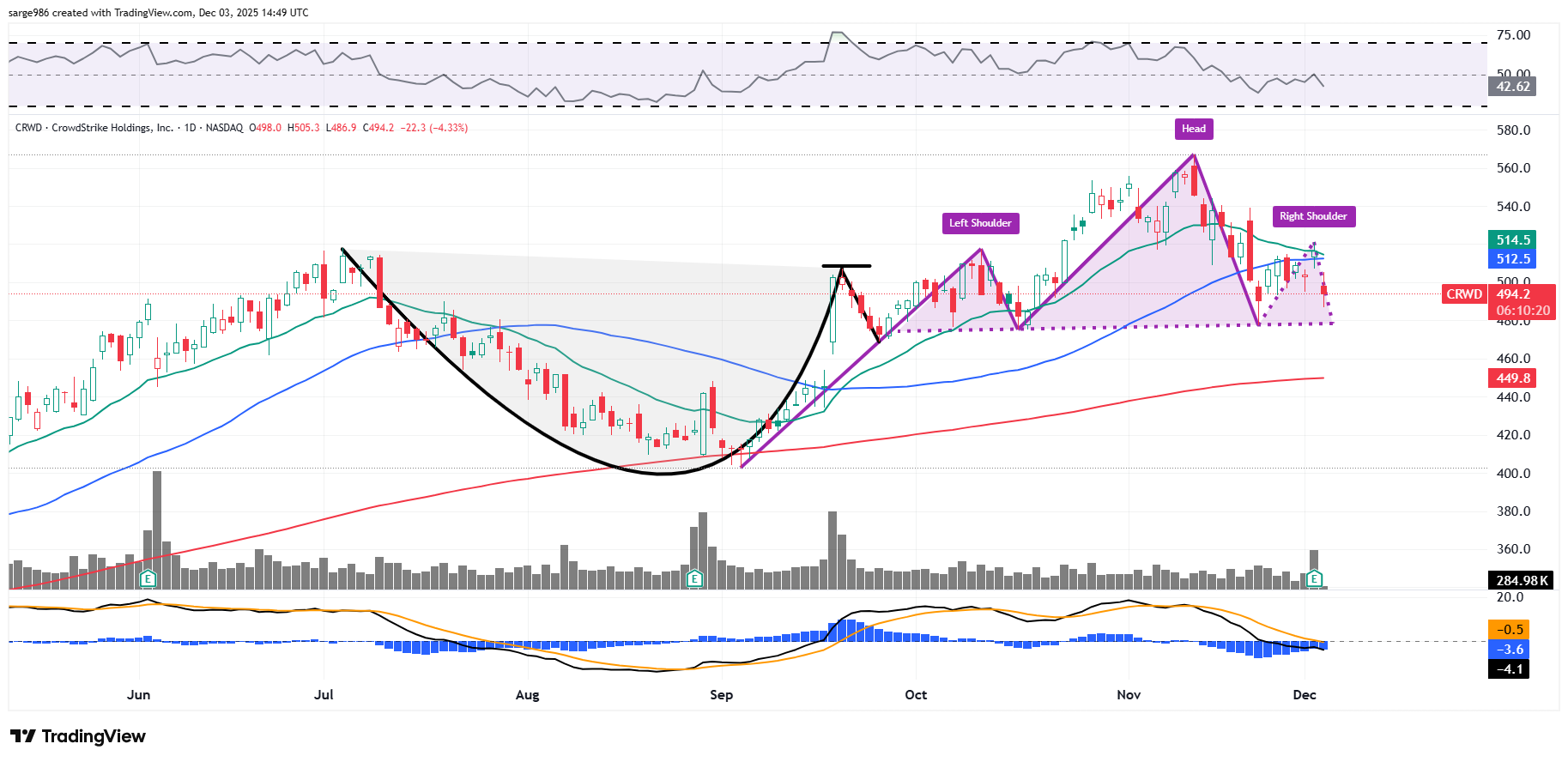 As CRWD is a top-five holding of mine and I am still up 57% in the name, I am not yet ready to cut and run. I will, however, should I see that pattern completed and the downside pivot triggered. Of course, should that happen, I would expect my exit to be temporary. This is, in my opinion, the "best in class" cybersecurity name. For now, relative strength is soft and the daily MACD sings a song of short to medium-term woe.
