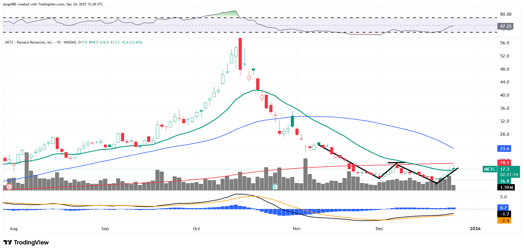 OK, the spike and selloff are apparently over. ​METC has developed a double bottom pattern of bullish reversal this November/December with a $19 pivot. The stock is also closing in on its 200-day simple moving average (SMA), which is running alongside that pivot. That test will be crucial.