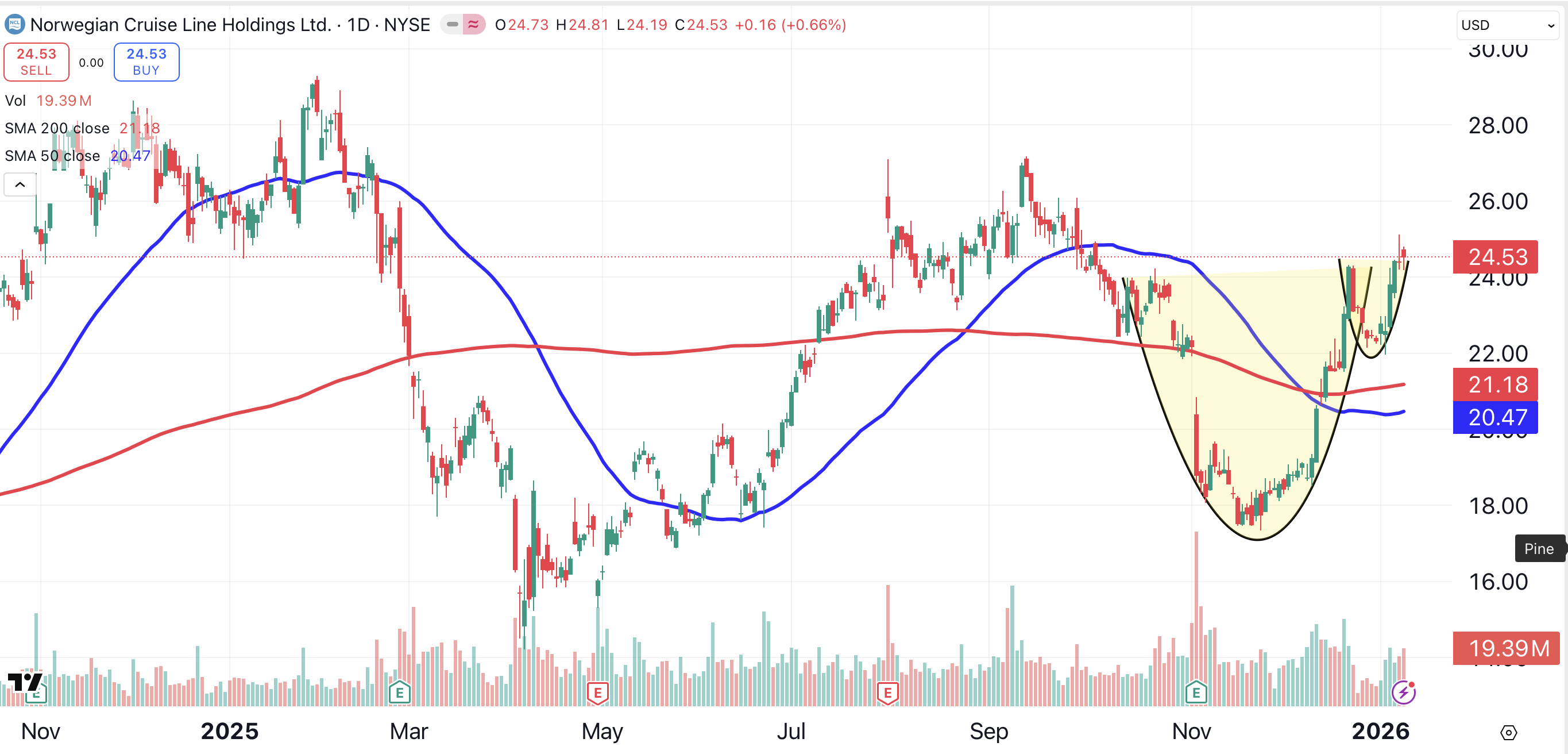 Like Carnival, Norwegian Cruise Line Holdings (NCLH) has formed a cup-andhandle pattern (shaded yellow). This formation suggests a new target price of $31 for the Miami-based company.