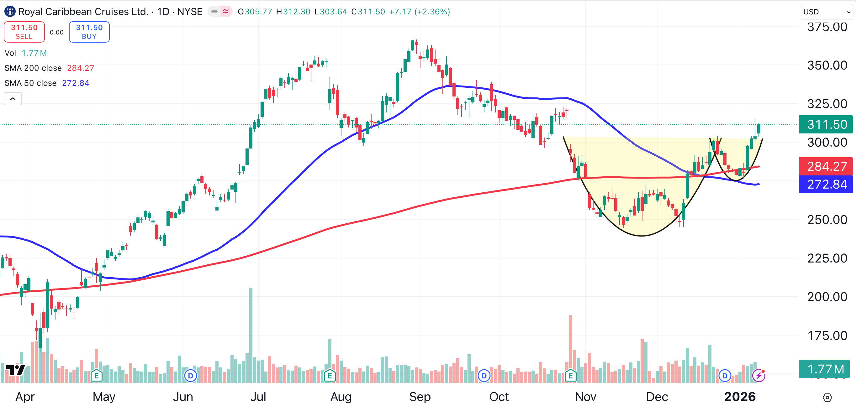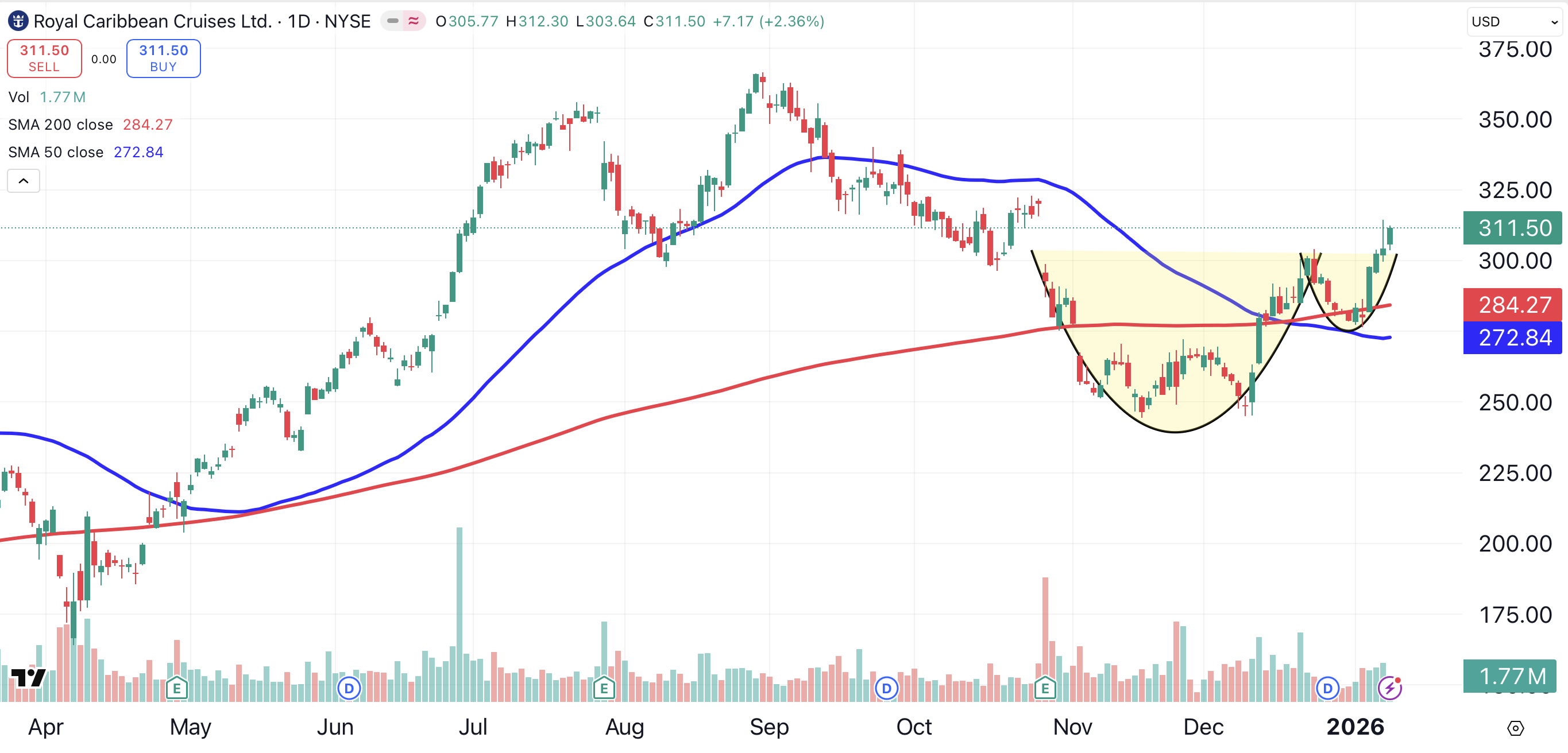 Royal Caribbean Cruises (RCL) also has formed a cup and handle (shaded yellow). The pattern projects the stock to the $360 area.
