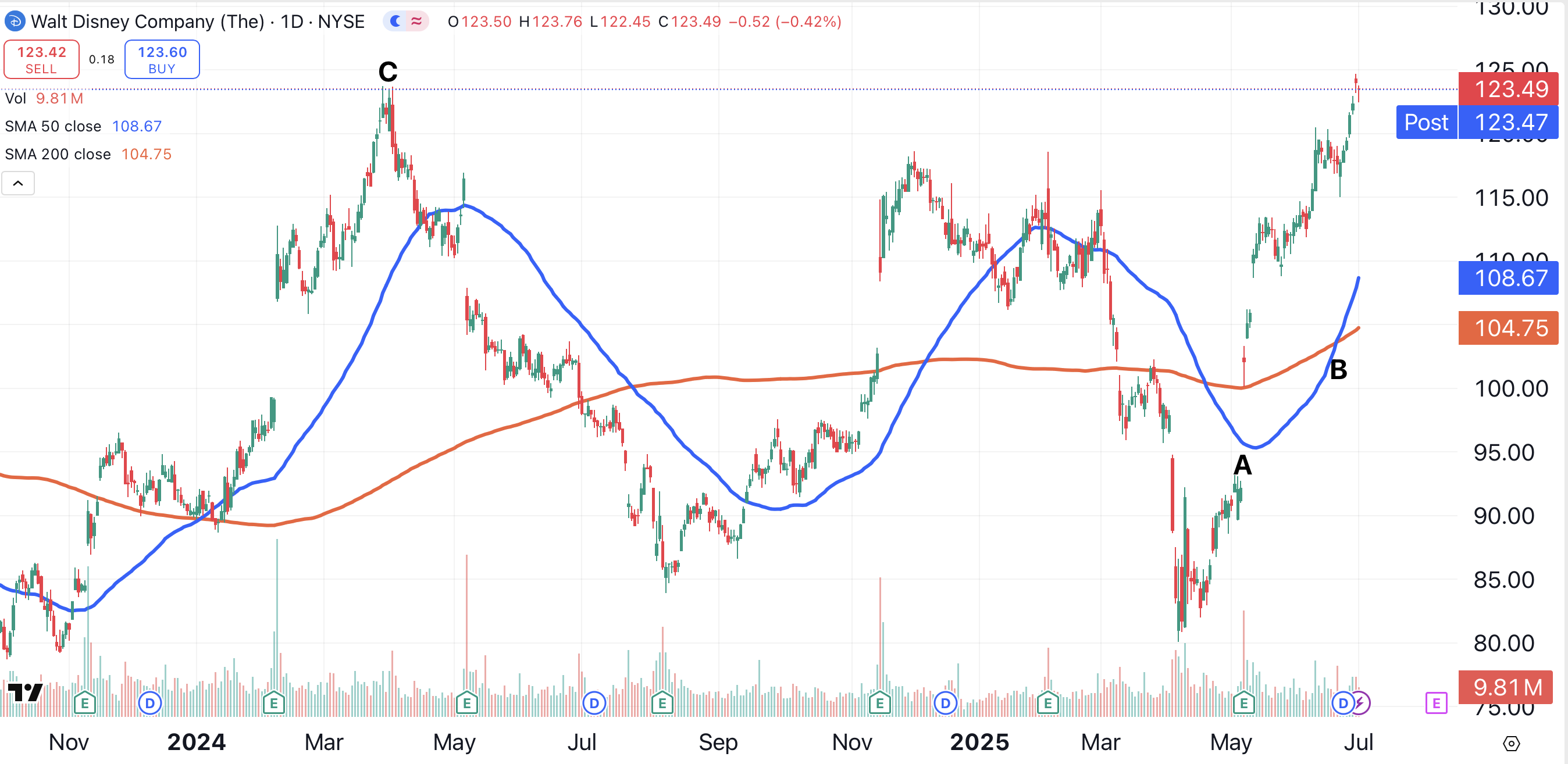 That’s right. Over the past three months, Disney is outperforming the overall market, and is even beating some of the top names in tech. Could it be that the House of Mouse is finally back on track? Let’s go to the charts to find out, starting with Disney’s daily chart.