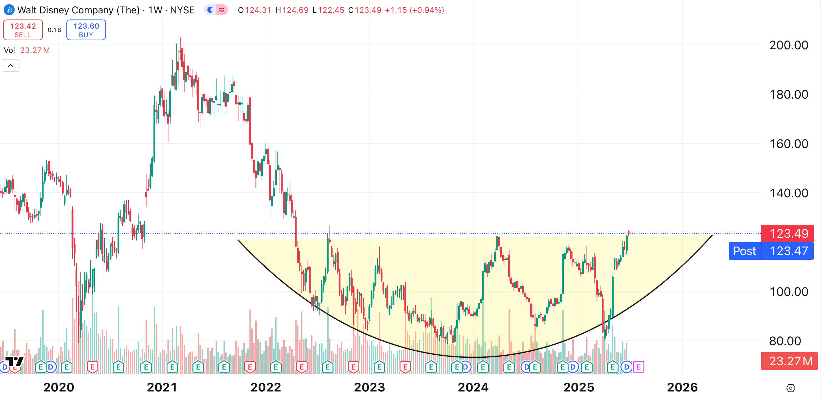 However, if we zoom out to Disney’s weekly chart, a significant pattern is now visible. Shares of Disney have formed a huge rounded bottom pattern (shaded yellow) over the past three years.