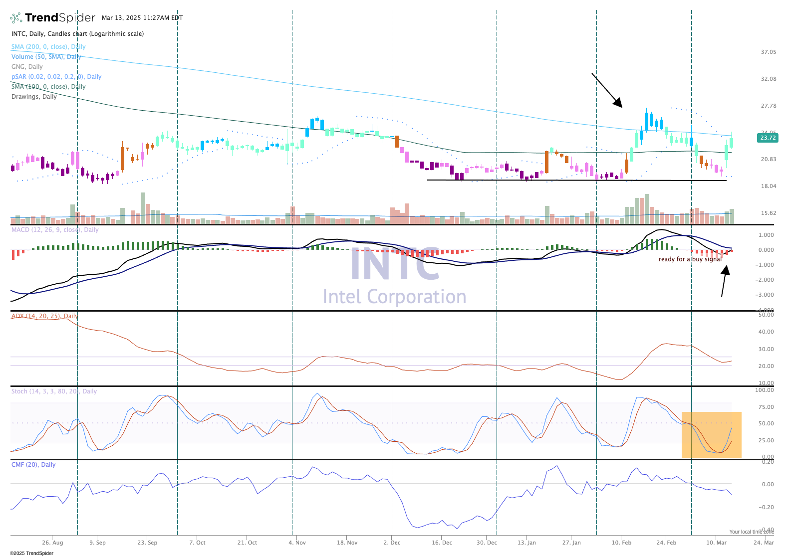 The chart is improved and was recently upgraded from bearish to modestly bullish. Notice the long base from the $19 to $21 area that defined a nice bottom for Intel. A recent pop in February then a retest of that $19 zone appears to be a "safe" place to enter the stock.