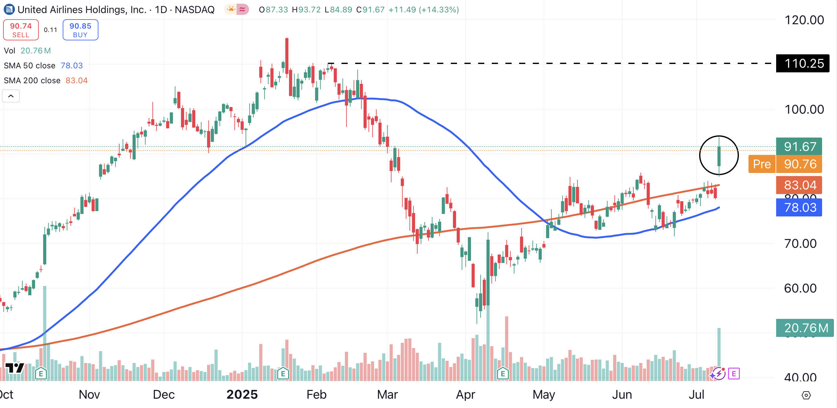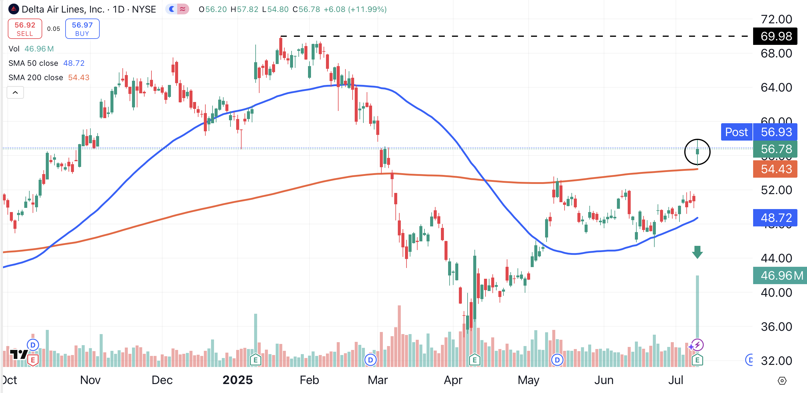 Traders boarded the stock in a hurry, sending Delta soaring to a three-month high (circled). Delta closed cleanly above its 200-day moving average (red) for the first time in three months.
