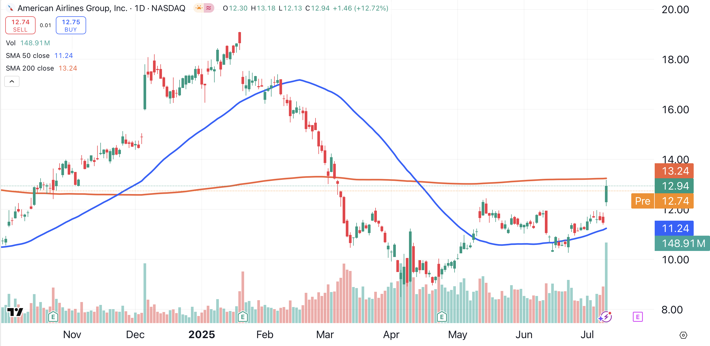 The chart of American Airlines reveals weakness when compared to its competitors above. While shares of American vaulted higher by 12.72% on Thursday, they failed to climb above the stock’s 200-day moving average (red).