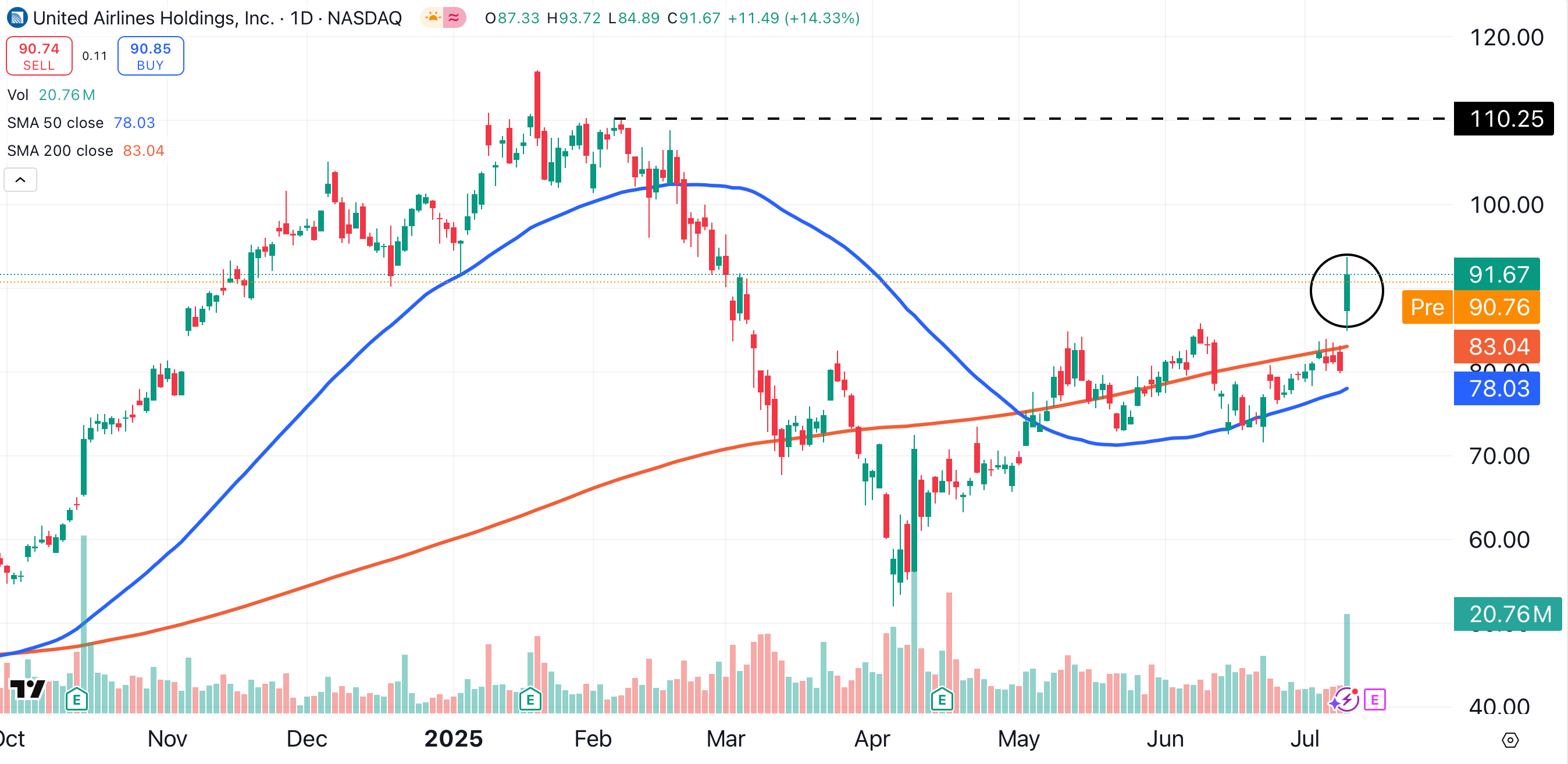 Based on this chart, United’s new target is $110. This figure represents a gain of 20% from Thursday's close, and is based on an area of resistance left over from January/February (black dotted line).