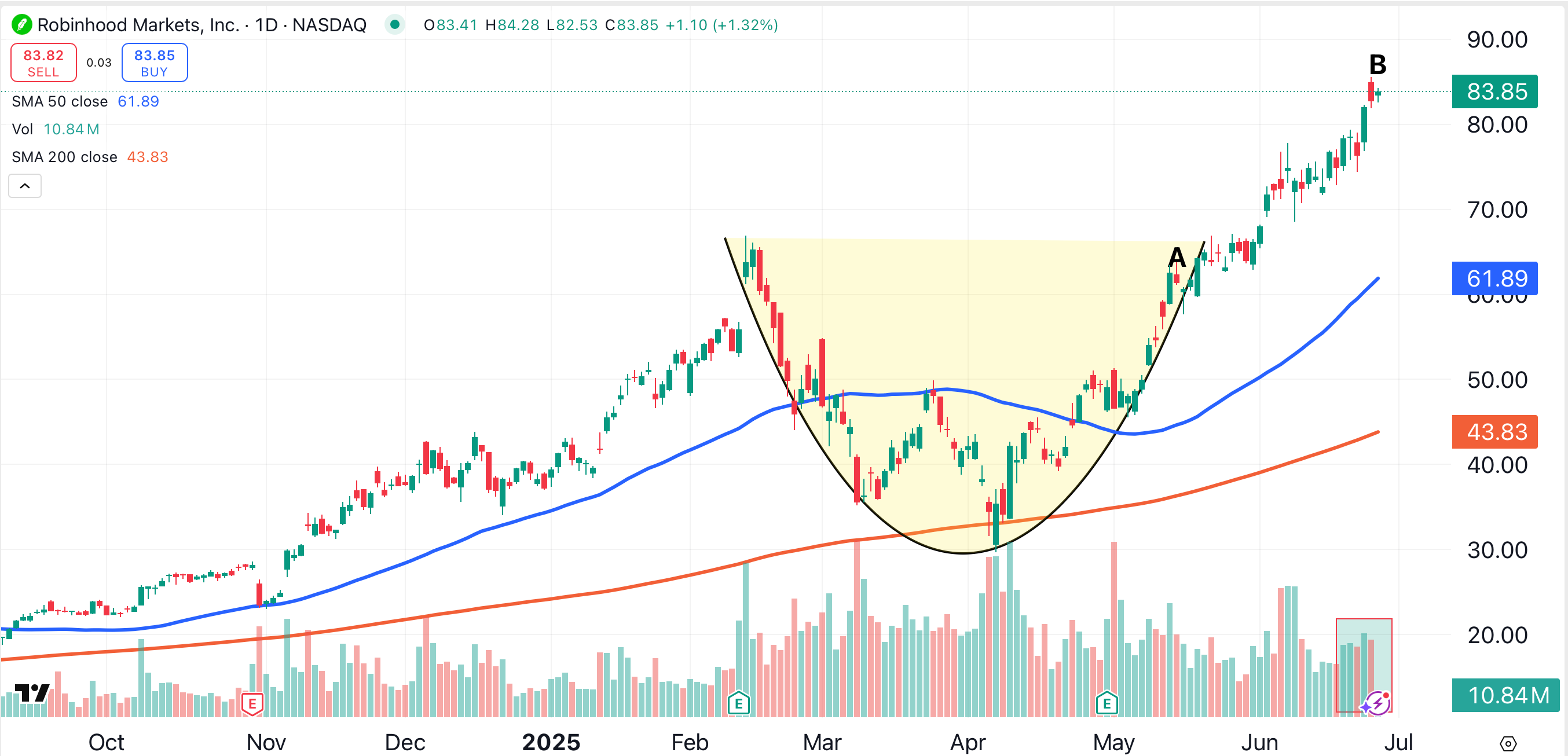 When we recommended Robinhood last month (point A), the stock was about to break out of a rounded bottom pattern (shaded yellow). Over the past month, Robinhood has gained over 26%, enough to reach our target price of $85 during Wednesday’s session (point B).