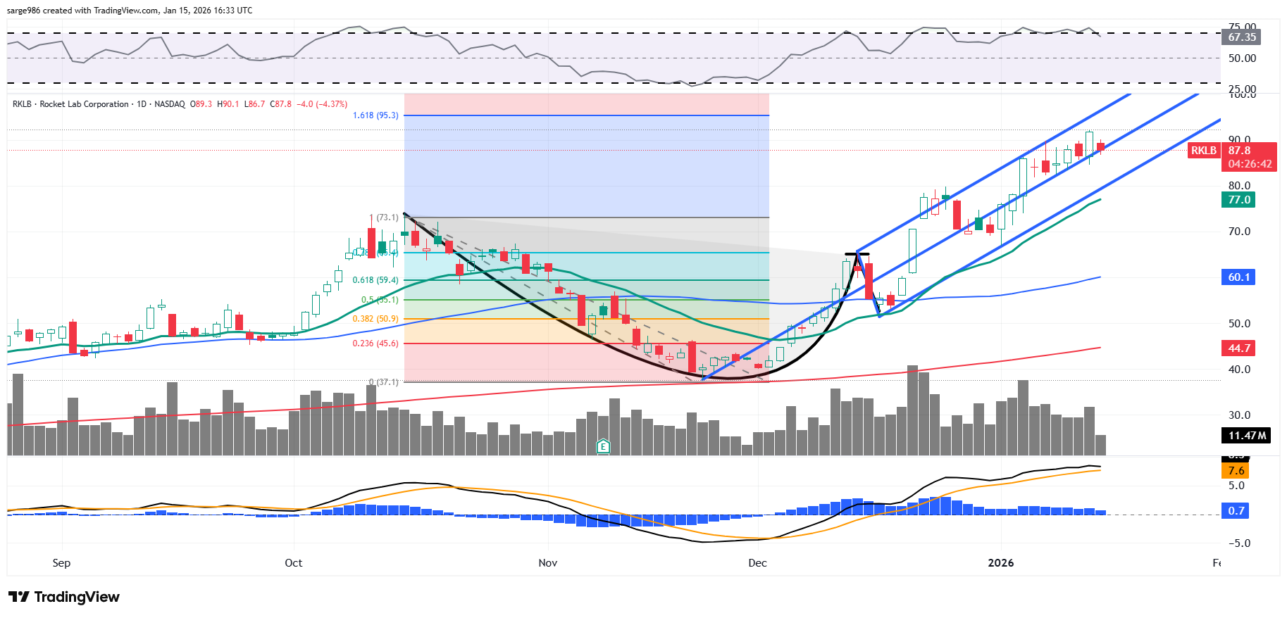 The last time I showed you this chart was on ​January 7, little more than a week ago. Even with today's nasty selloff, the shares are trading higher over that time. When I wrote that piece, RKLB was trading at $83.80. Down 4% on Thursday, RKLB is trading with an $88 handle.