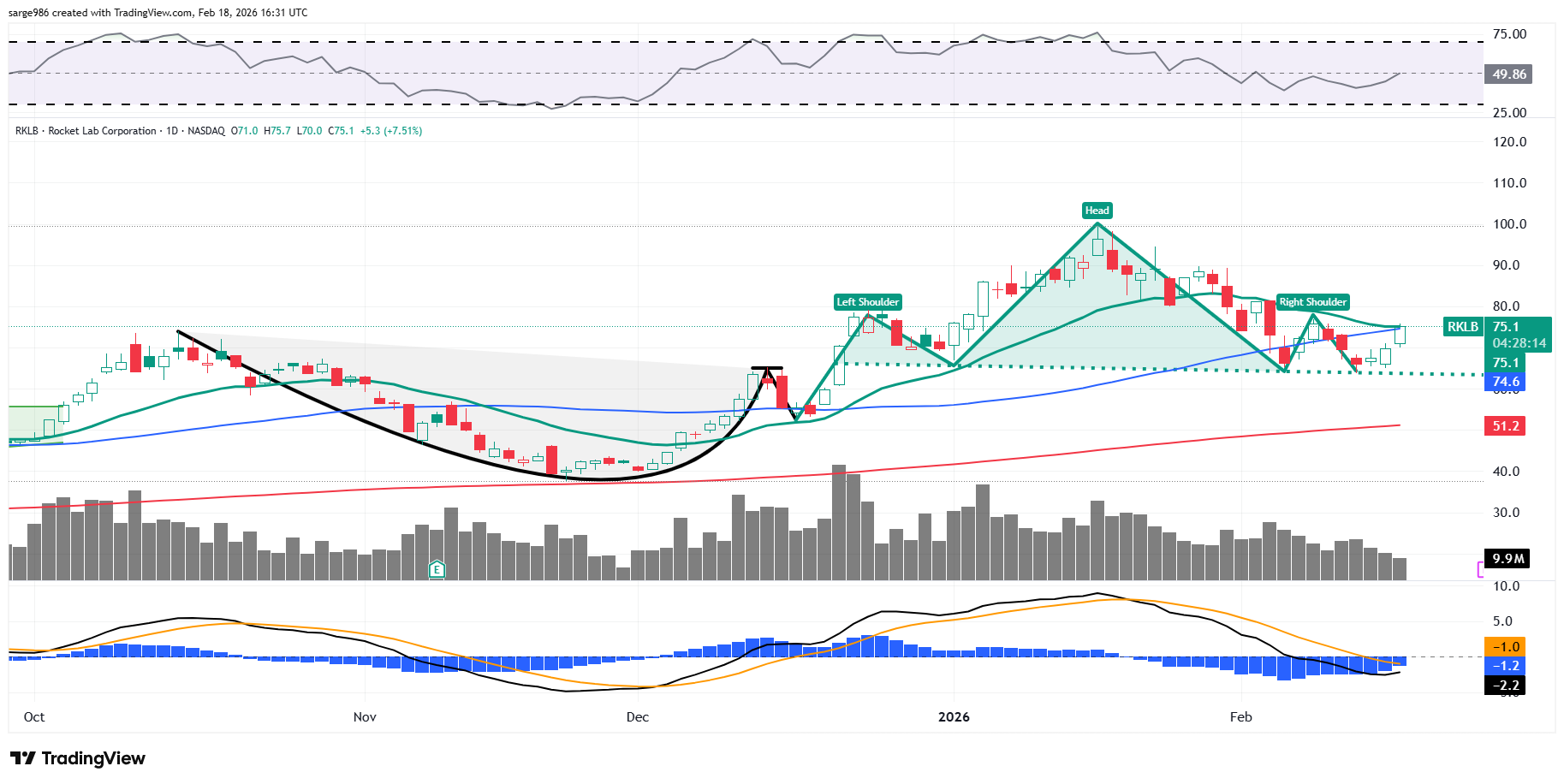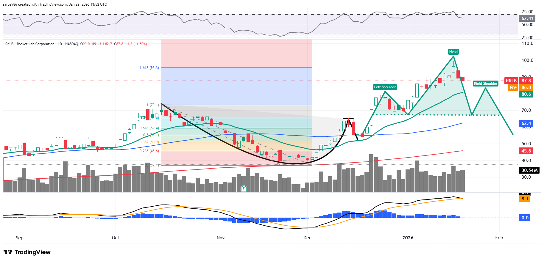 I last touched on RKLB's technicals for the public on February 2. I had warned of a developing head-and-shoulders pattern of bearish reversal as early as mid- to late January and refined that picture at that time. This is the chart from the original warning on January 22: