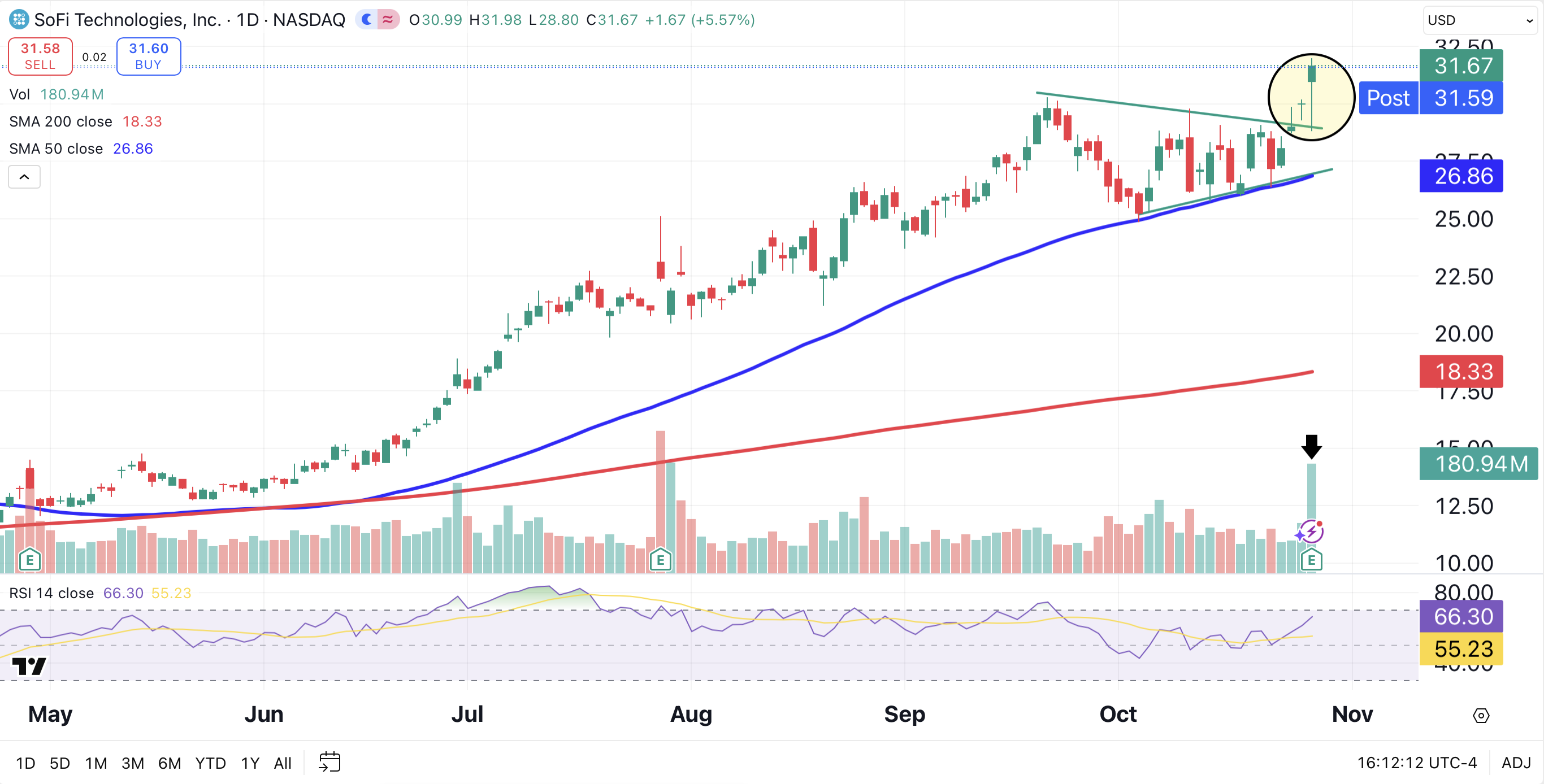 Shares of SoFi Technologies (SOFI) shot higher by 5.5% to reach an all-time high on Tuesday after the company reported solid earnings and revenue for its third quarter.