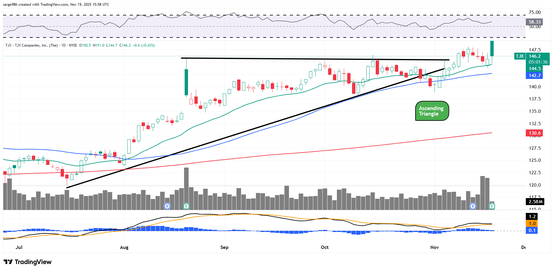 ​Readers will see that TJX has rallied sharply on Wednesday morning and then given back much of those gains. The stock is trying to break out from an ascending triangle of trend continuance. The stock tested pivot support on Tuesday and that support level held. This is encouraging.