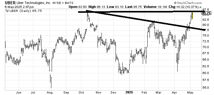We know I am a fan of Uber UBER and have been for quite a long time, but it is knocking up against the old high from October, so I’d like to see a pullback near 80-ish or some sideways action.