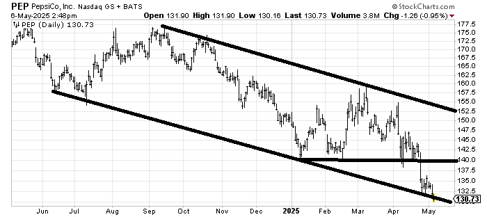 We had a great trade in Pepsi PEP earlier this year, but the stock is in a downtrend. It’s probably okay to bottom fish around 130—ish, but the resistance at 140 is formidable now.