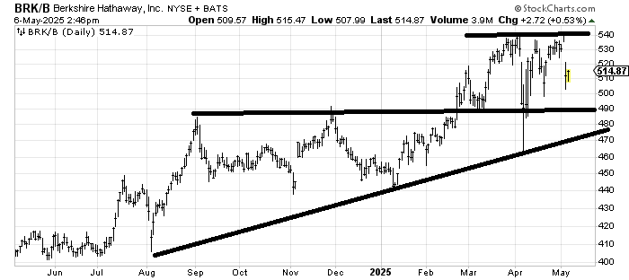 The question is where would I buy Berkshire Hathaway BRK.B, and that chart is not my cup of tea, so I can’t say where I would buy it right now. The pattern is a sideways nothing right now. If it came down to the 480-490 area in the next month or so, I’d probably take a look at it because it would be at support from the uptrend line and the flat line. But right here at 515, it’s in the middle of nowhere.