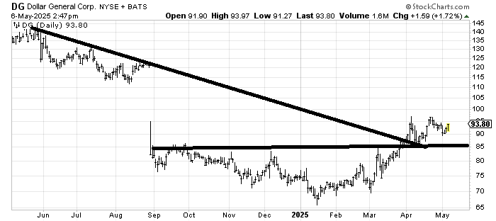 I would very much like Dollar General DG to fill that gap, but I think that might be a very tall order. However, the 90/100 rule ought to apply (90% of the stocks that make it to 90 will make it to 100), so it should get to 100. I also have a measured target from that base, around 100, and another at 105, so let’s call it 100-105.
