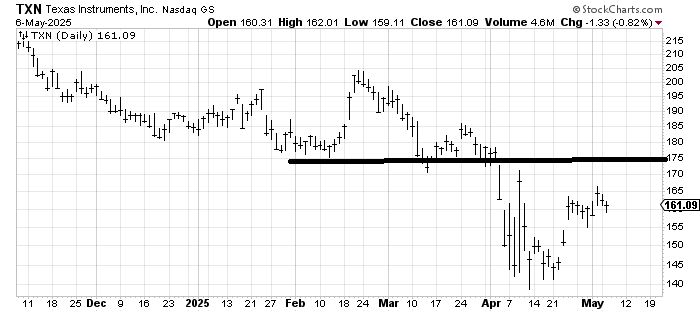 I want to talk about the chart of Texas Instruments TXN. It had better-than-expected earnings about two weeks ago—that’s the gap up from 145 to 160 on the chart. But notice that the rally lasted two days, and while it popped last Friday, it really hasn’t made any headway since the gap on earnings. That is the chop I talk about. A lot of charts have it.