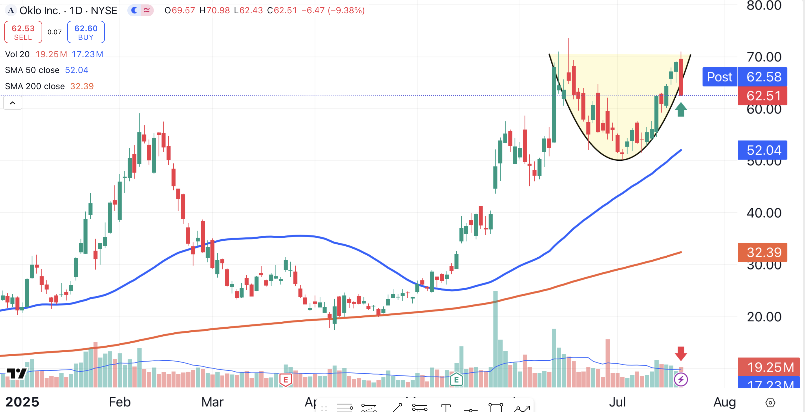 The selloff comes as the stock is forming a potential cup-and-handle pattern (shaded yellow). That bullish pattern, if completed, suggests that OKLO could rise to $90 per share.