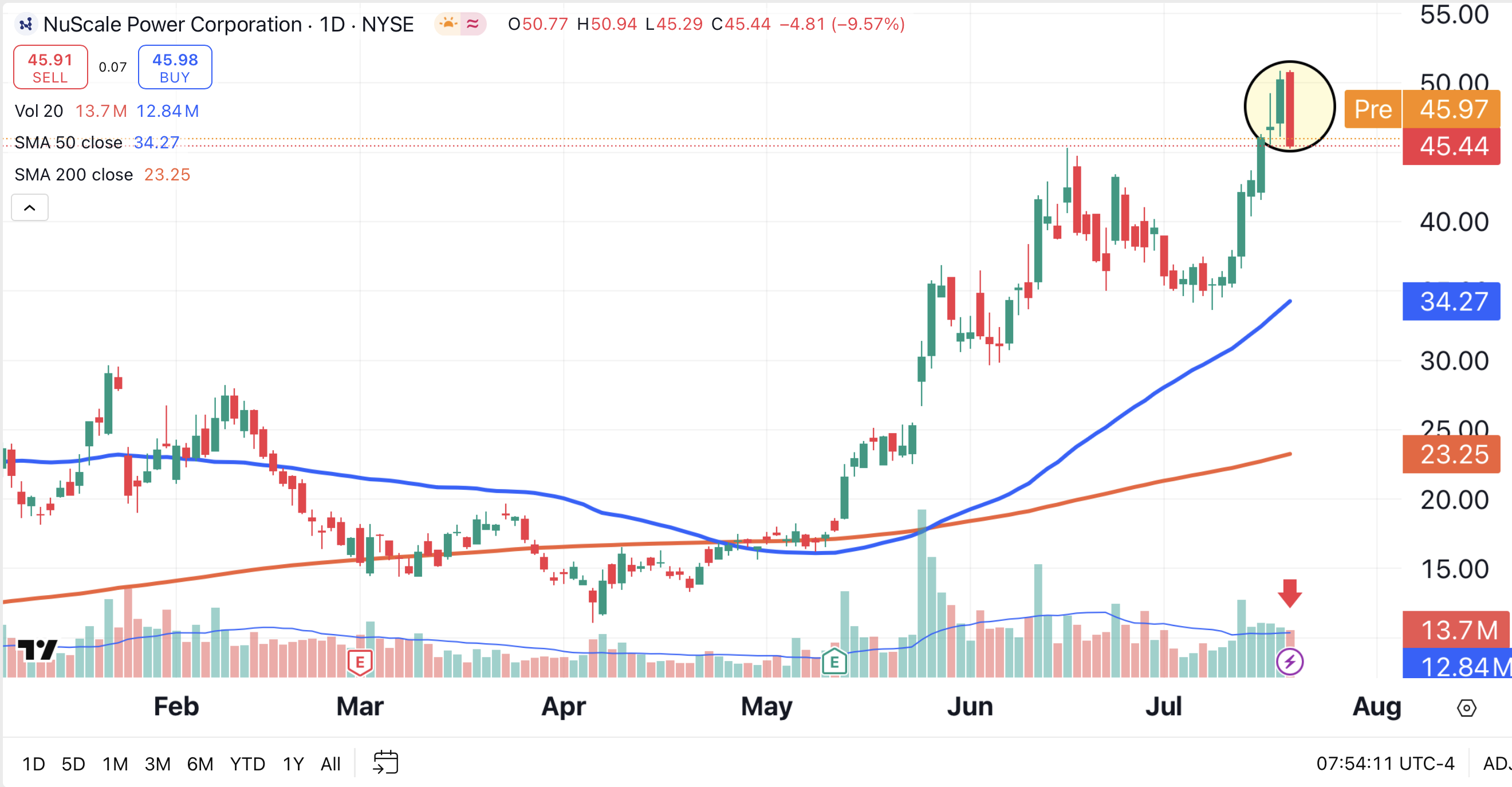 While NuScale’s chart is still trending upward, the stock did form a bearish engulfing pattern on Monday (shaded yellow). On the bright side, like Oklo, NuScale fell on light volume (red arrow). The stock’s downward momentum might continue before it resumes its bullish trend.