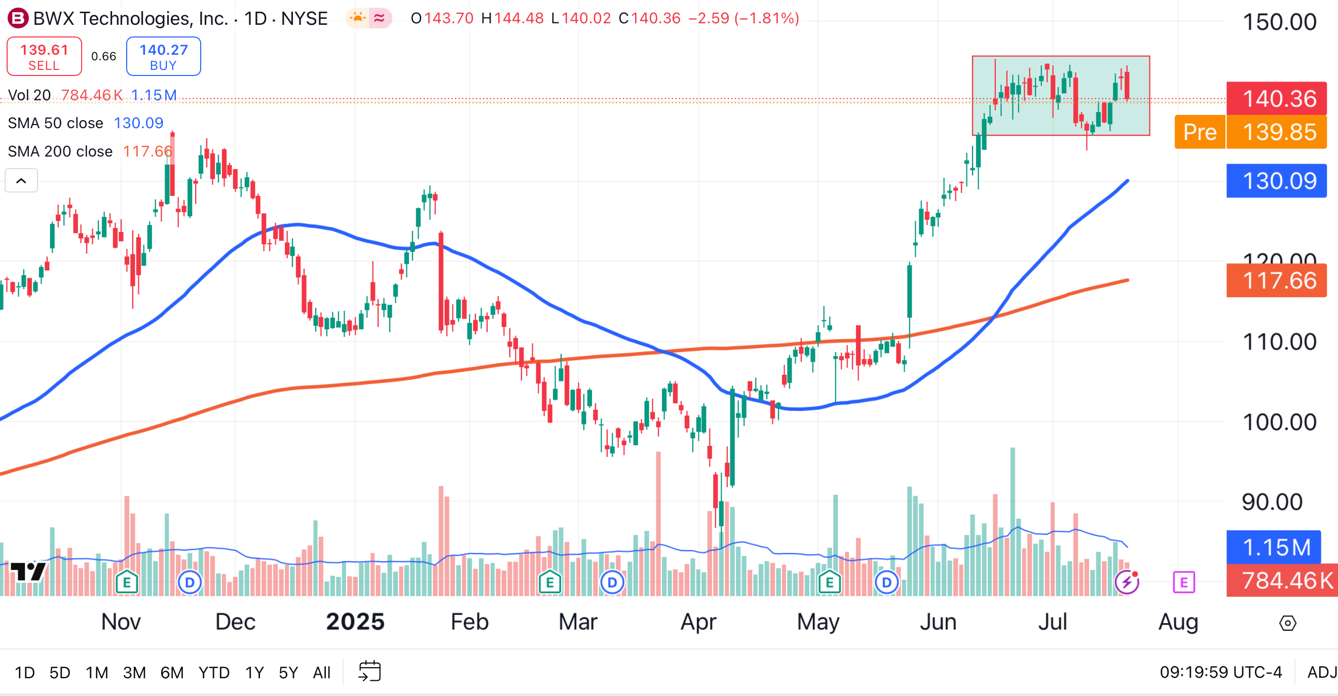 Unlike the names listed above, shares of Lynchburg, Virginia-based BWX Technologies BWXT held firm on Monday, falling just 1.8%. For the past month, BWXT shares have been consolidating between $135 and $145 (shaded green).