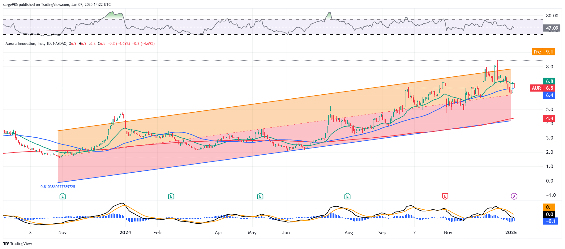 Not only does Aurora not make money, it doesn't really drive revenue. My thought is to pick up a few shares and forget about them for a while. I won't hold them to my 8% rule as I rarely do with very low-priced stocks. I just won't be buying any of these shares today. I will wait for either the top trendline of the regression model or the 50-day simple moving average to be tested from above, and if it looks like the company is on the right path ... then I would plunk down a few bucks. I said a few. This will not be a major investment.