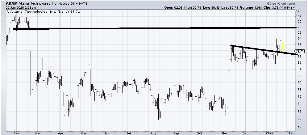 I would have thought Akamai (AKAM) would fill that overhead gap and it hasn’t. Now I would say it needs to hold this 88-ish area. If it holds, then the gap is still in play. I mean, that was a breakout from a base in November so I don’t want to get bearish too soon.
