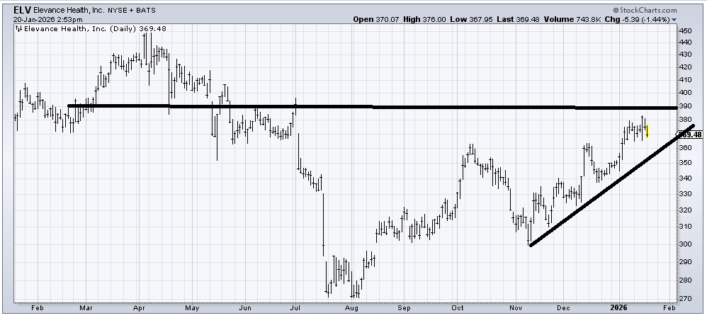 Elevance Health (ELV) is into resistance, so at the very least, I think it needs a pullback to that uptrend line. I would reassess if it breaks the line.