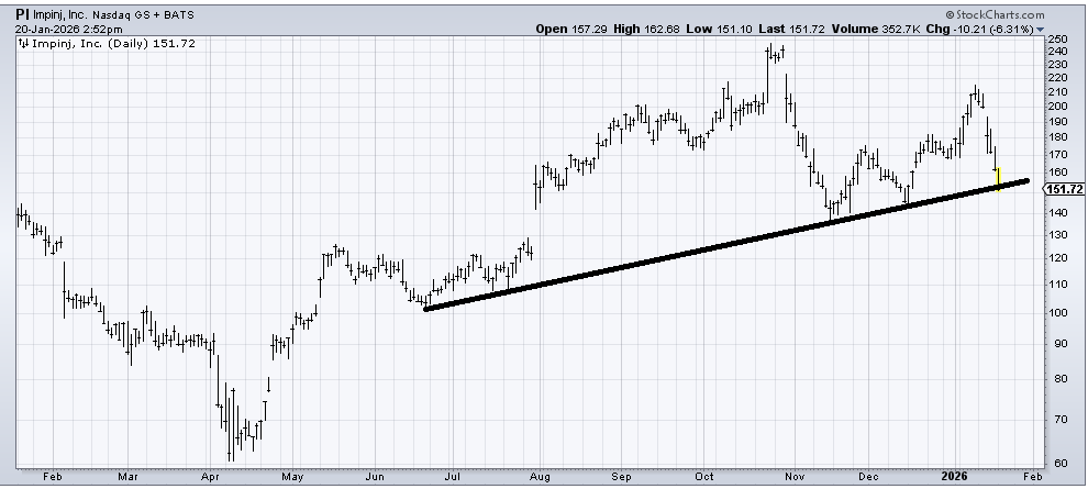 Impinj (PI) is coming into some support now, but even if it bounces, I’d be very careful if it does not bounce well, because if it can’t bounce well, I think 120-30 is coming next.