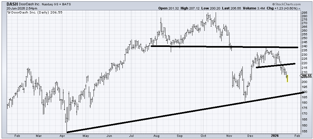 DoorDash (DASH) is in the middle of nowhere, not at support, not at resistance. I’m inclined to think a rally to the 220 area fails and/or a plunge to 190 sees a bounce.