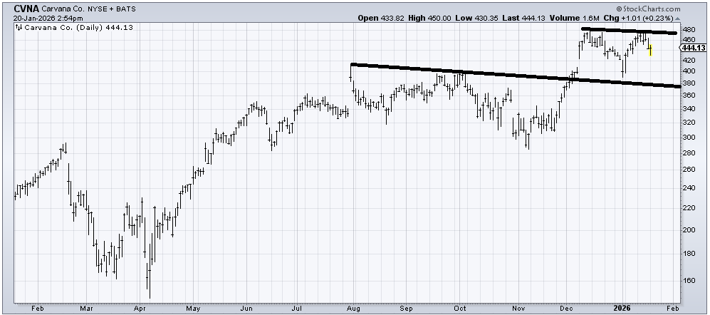 Carvana (CVNA) is another chart in the middle of nowhere. Resistance at 480 and support near 380.