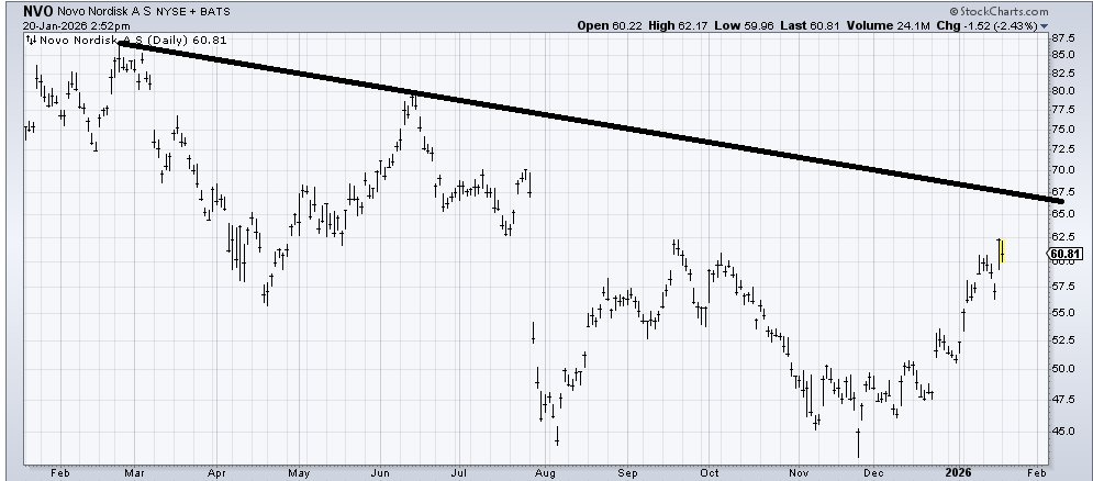 I liked Novo Nordisk (NVO) a few months ago, and it’s still a basing chart, but it could use a pullback to digest the move. I just can’t decide how far down it needs to go. I’m going to call it a hold for now if you can stand some short-term volatility.