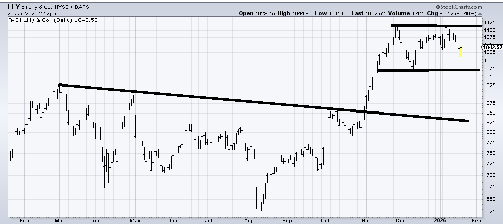 Eli Lilly (LLY) hasn’t done anything wrong, but that base measured to 1125, which is where it got to two weeks ago. Now it either needs a serious correction or some sideways action. For now, I will call it a trading range between 975 and 1125.