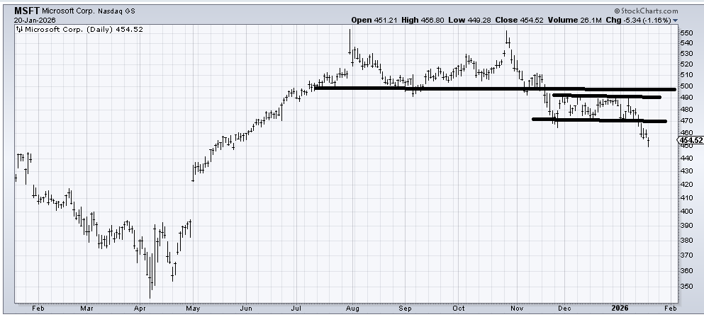 I turned sour on Microsoft (MSFT) when it couldn’t recapture that 500 area after three attempts. It has now fallen out of the sideways action for the last two months. But I want to do a little math after I point out that the stock closed well off its lows today.