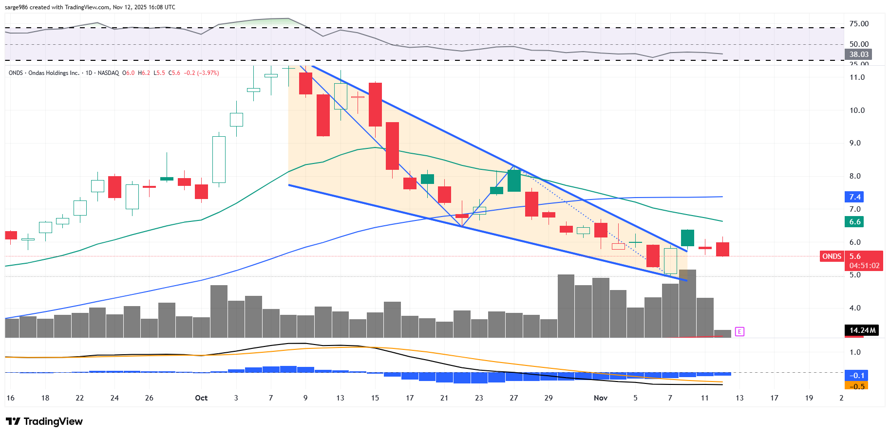 ONDS is trying to put in a floor and break out of a falling wedge of bullish reversal. On Monday, the stock broke out past the upper trendline of the model. These past two days have been spent trying to hold that line.