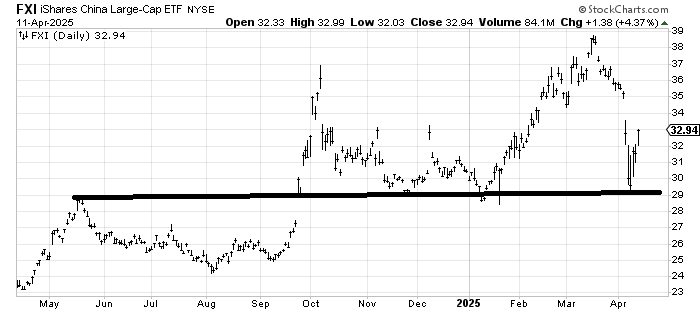 I had wanted FXI to come down to 33, but it had other ideas and, instead, came all the way back to the bottom of support at 29. Now, it has resistance at 33-35. My inclination is to see if it can fill the gap and then just go quietly sideways without much violence. Then, take another look. Because if we step back the chart has been in a giant sideways since October.