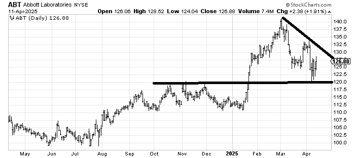 In the big picture, Abbott Labs ABT looks like a stock that broke out and has come back to test the breakout, so on a longer-term basis, this is the area we should like the chart. On a short-term basis, 132-133 is going to be resistance. I’d like to see it cross that downtrend line.